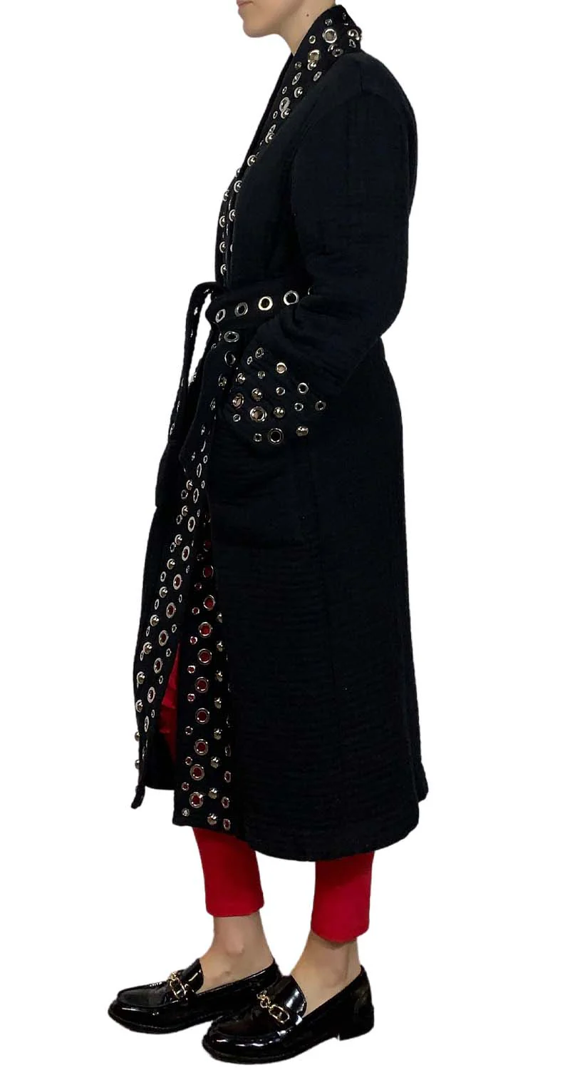 Abrigo Negro quilted con multiples ojales y tachas decorativas, tiene cinturón.