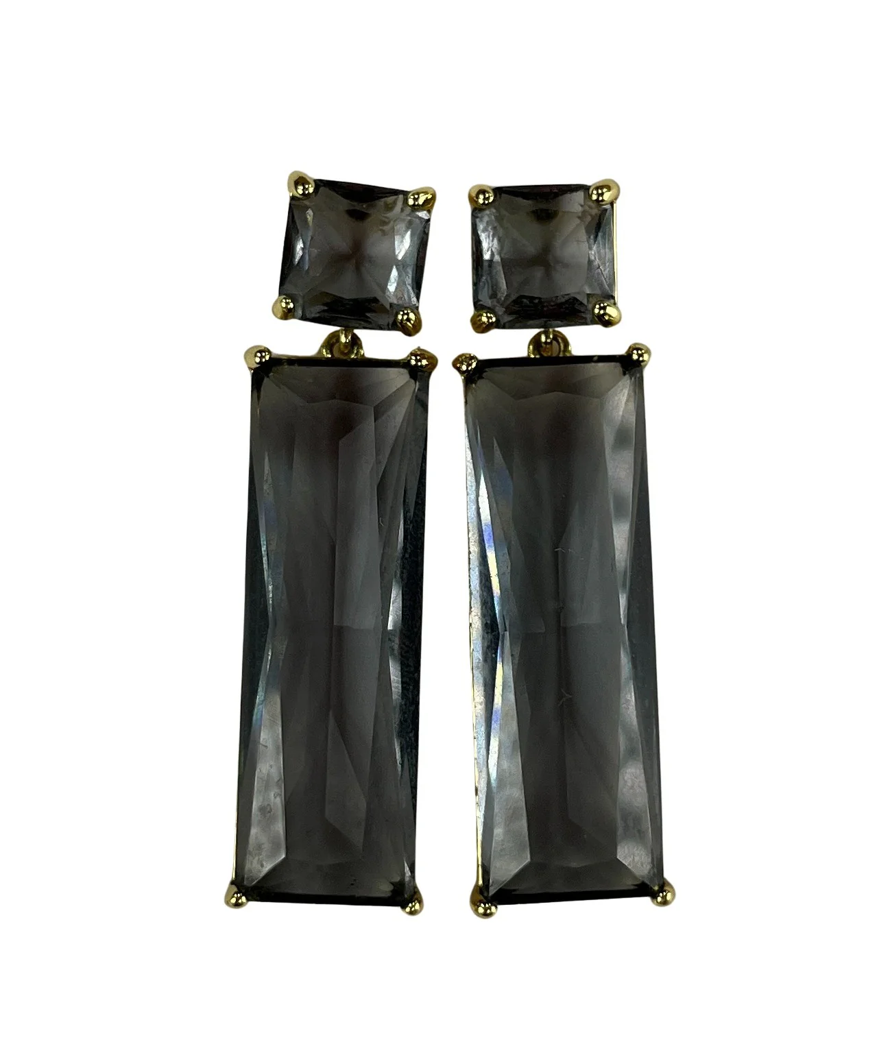 Aros bañado en oro con cristales en forma de cubo y rectángulo. Cierre tipo caja grabado con logo PG. Medida: 4.5 x 1 cm.