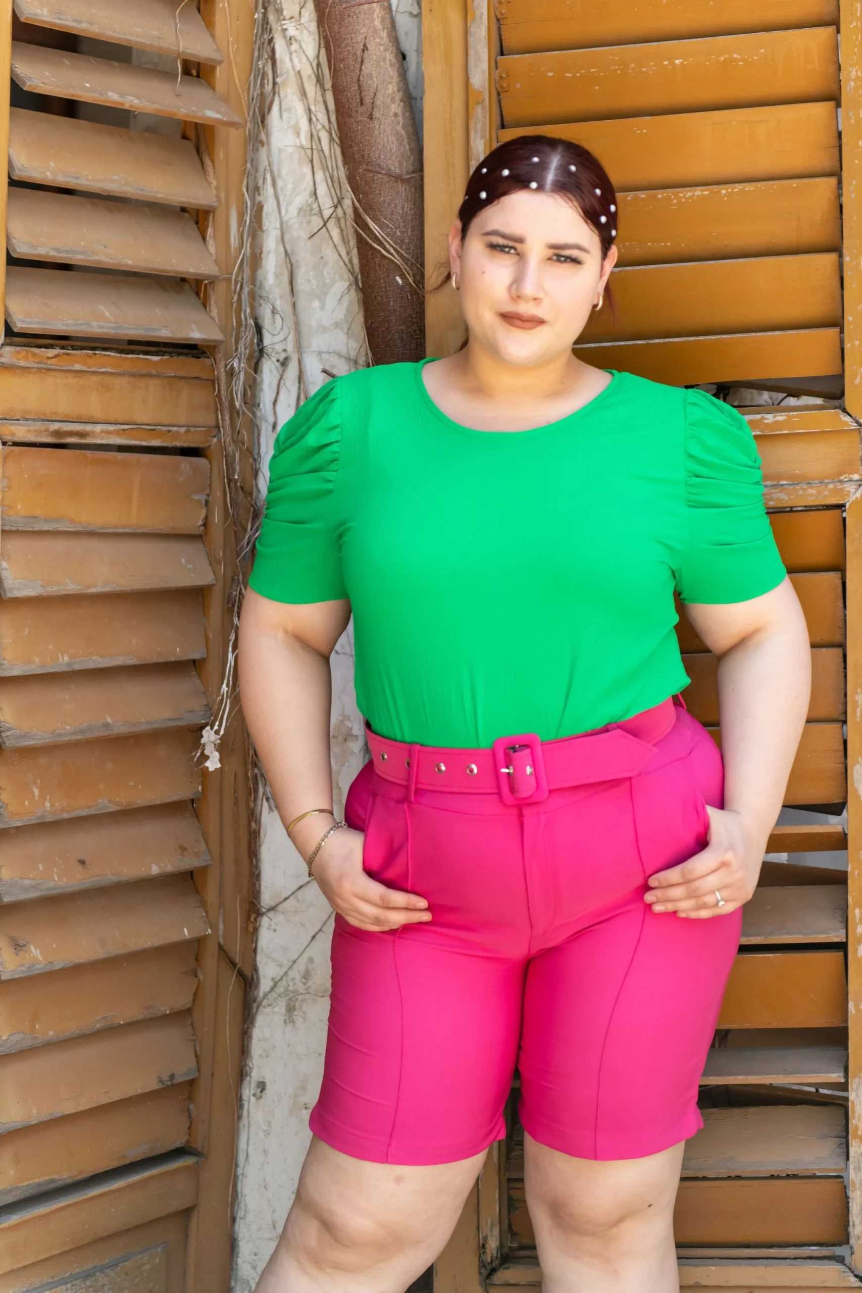 Biker short de vestir, modelo de diseño con cinto, corte semi corto arriba de la rodilla, estilo liso en cinco diferentes colores: