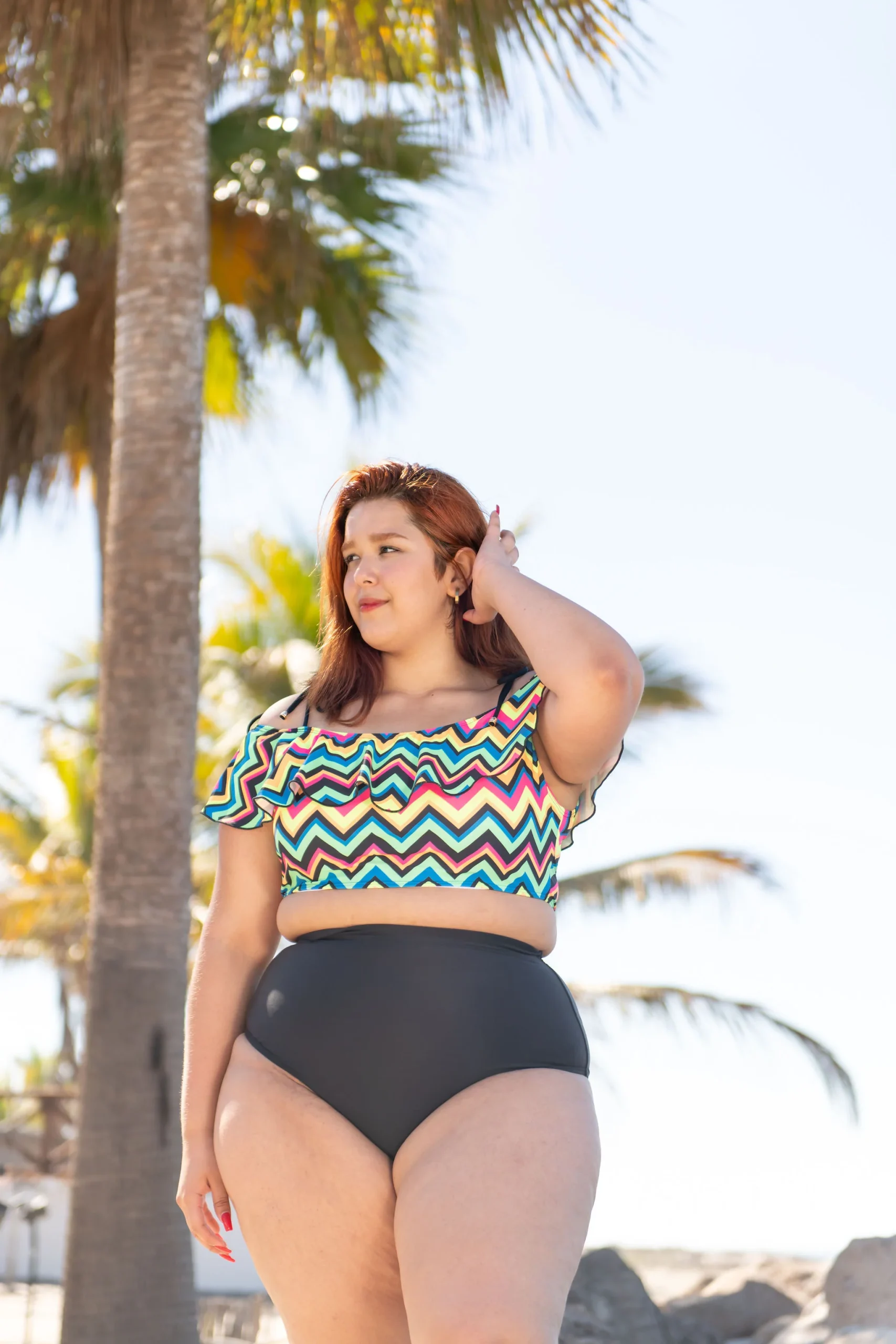 Bikini de diseño estampado. Top con tirantes y olán tipo manga a los hombros. Parte de abajo con corte alto.