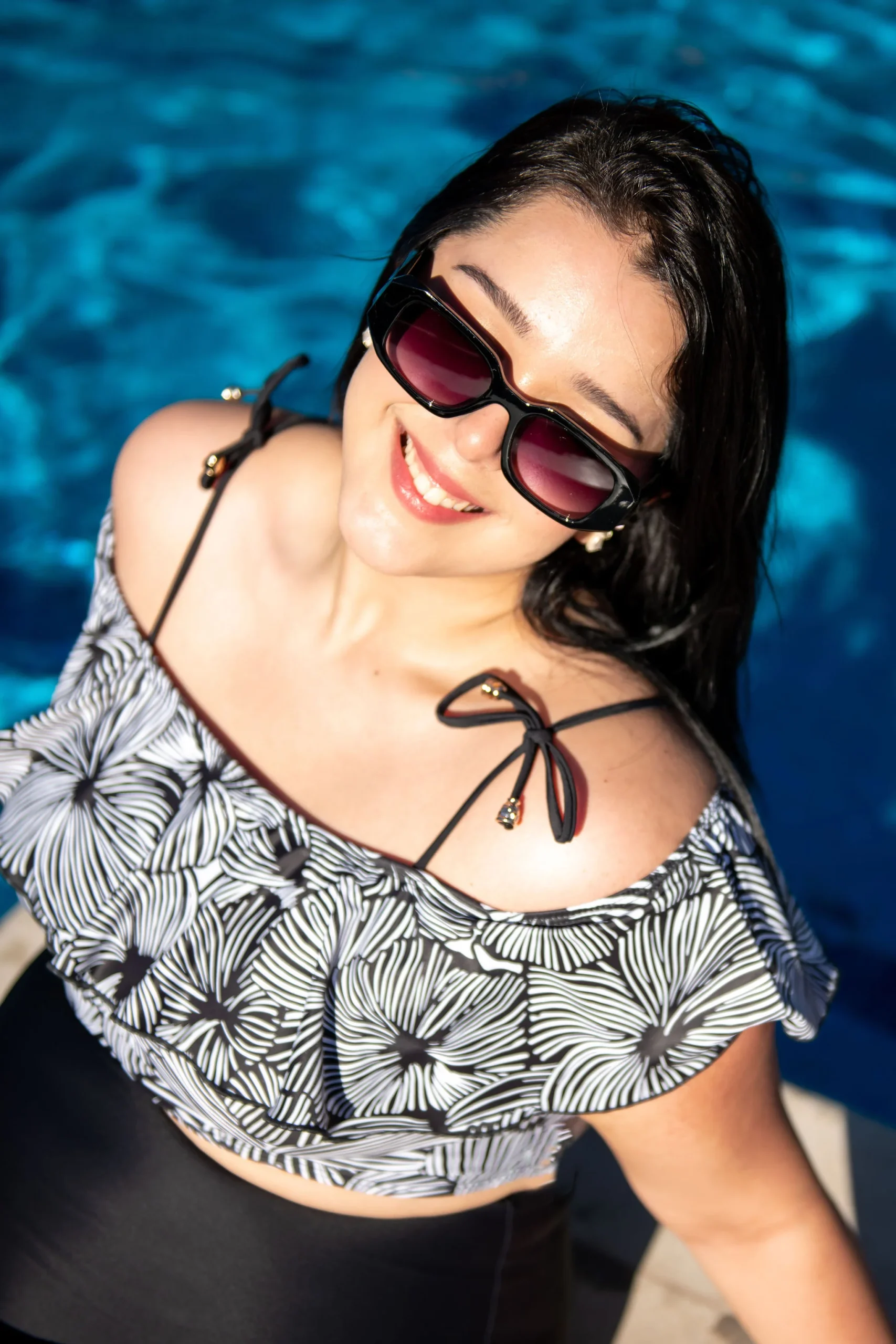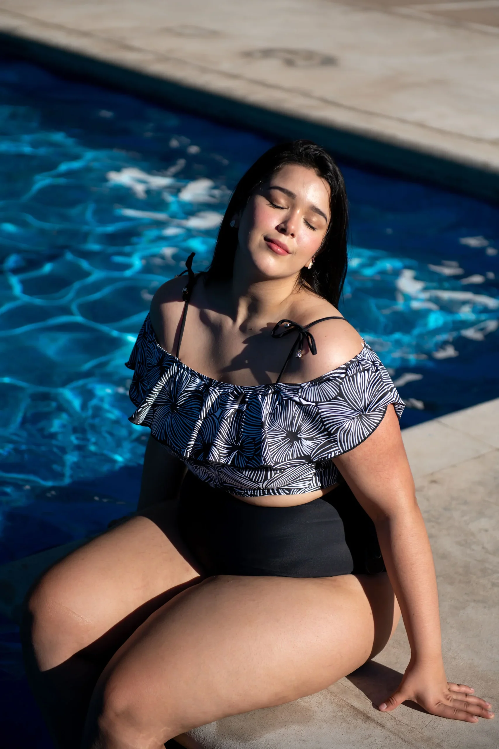 Modelo con diseño de dos piezas, con parte alta de cordones gruesos y olán, y parte baja lisa color negro súper stretch cuenta con pantie incluida. Diseño de parte alta con estampado de color NEGRO súper COOL e ideal para lucir ESPECTACULAR.