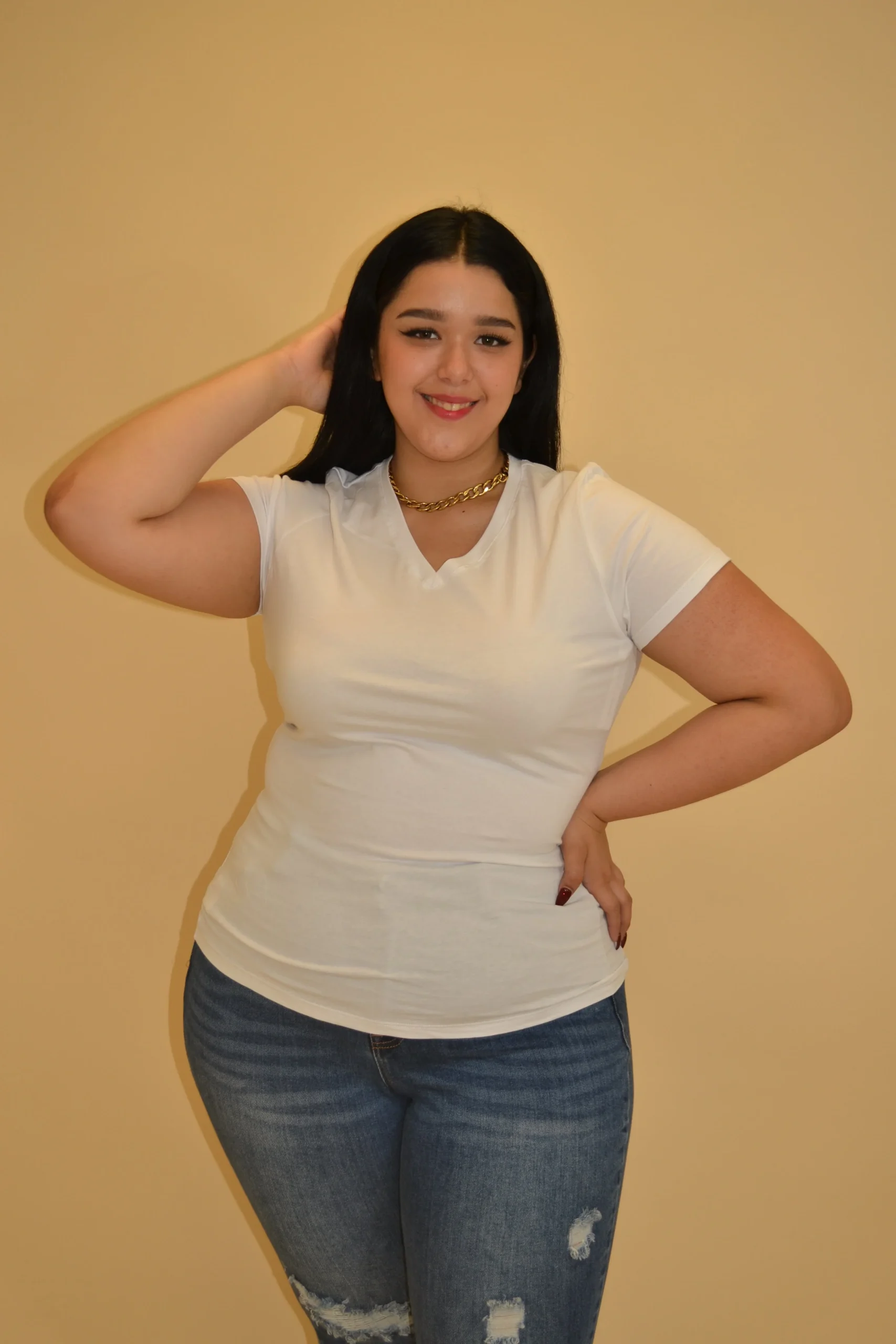 BLUSA BASICA, MANGA CORTA, CUELLO EN V, DISEÑO LISO, TELA DE ALGODÓN, SUPER STRETCH.