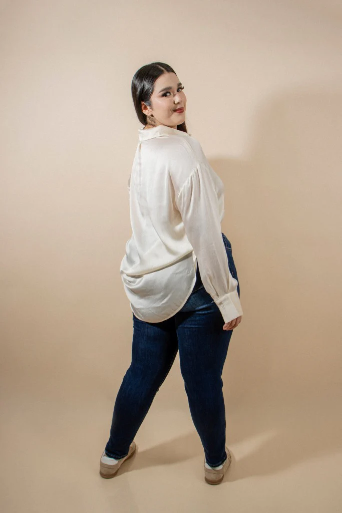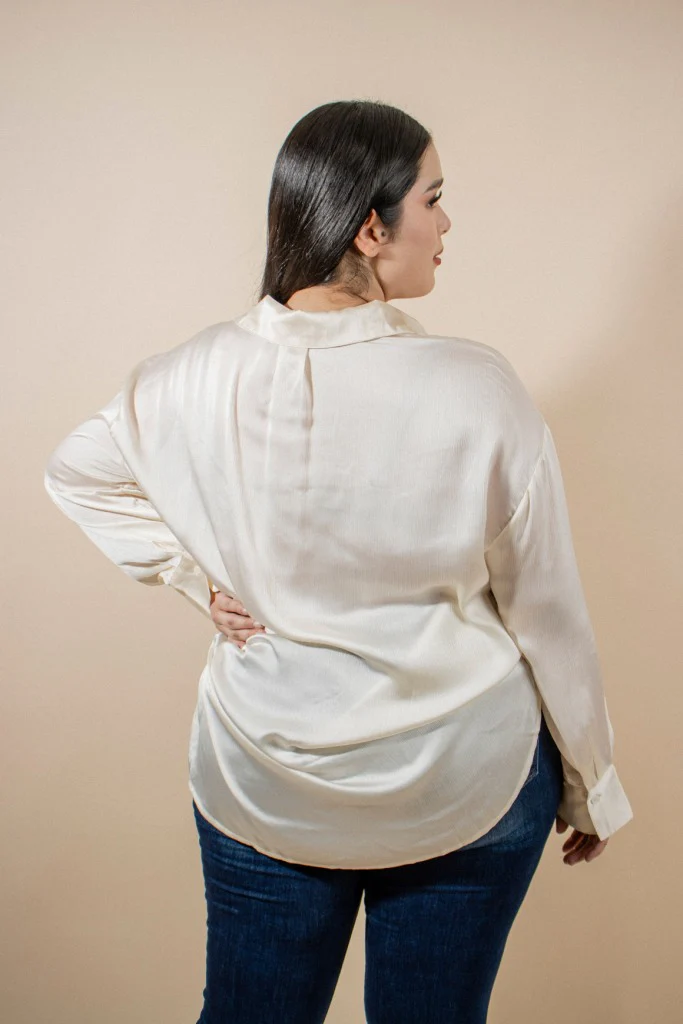 Blusa camisera de tela satin, modelo manga larga con botones forrados de misma tela, estilo camisa de botones. estilo overzide Ideal para usarse en conjunto con pantalón de vestir, en compañía de unos SÚPER JEANS o como sobre camisa.