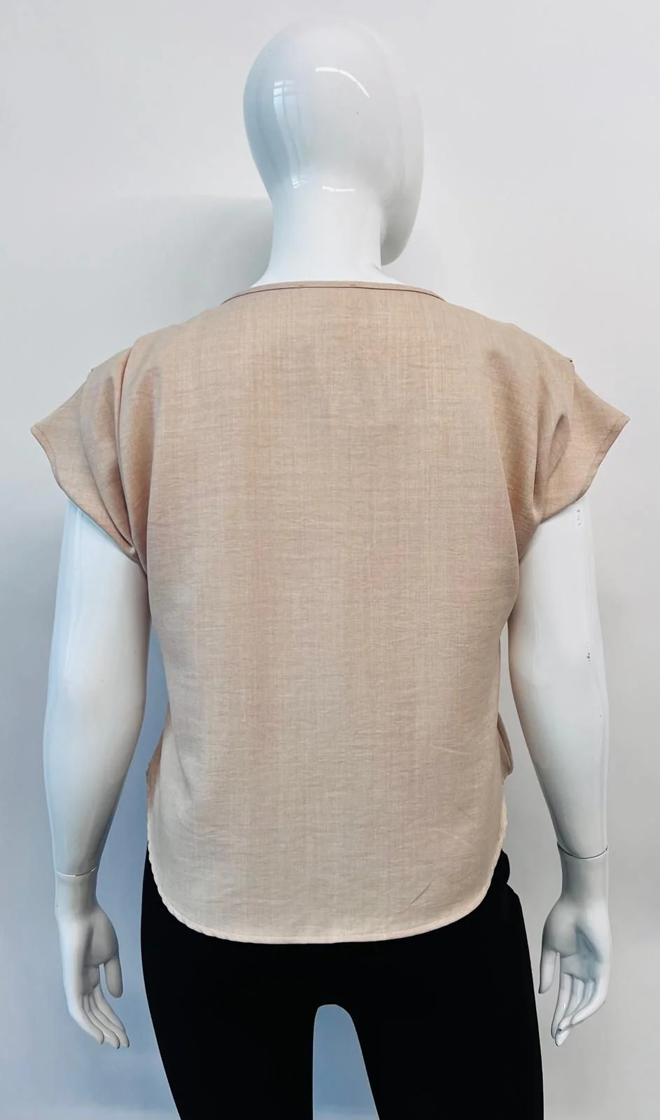 Blusa en tela tipo lino super fresca, modelo sin manga corte pemplum, cuello V clásico con botones en la parte frontal, nivel de stretch de medio a bajo.