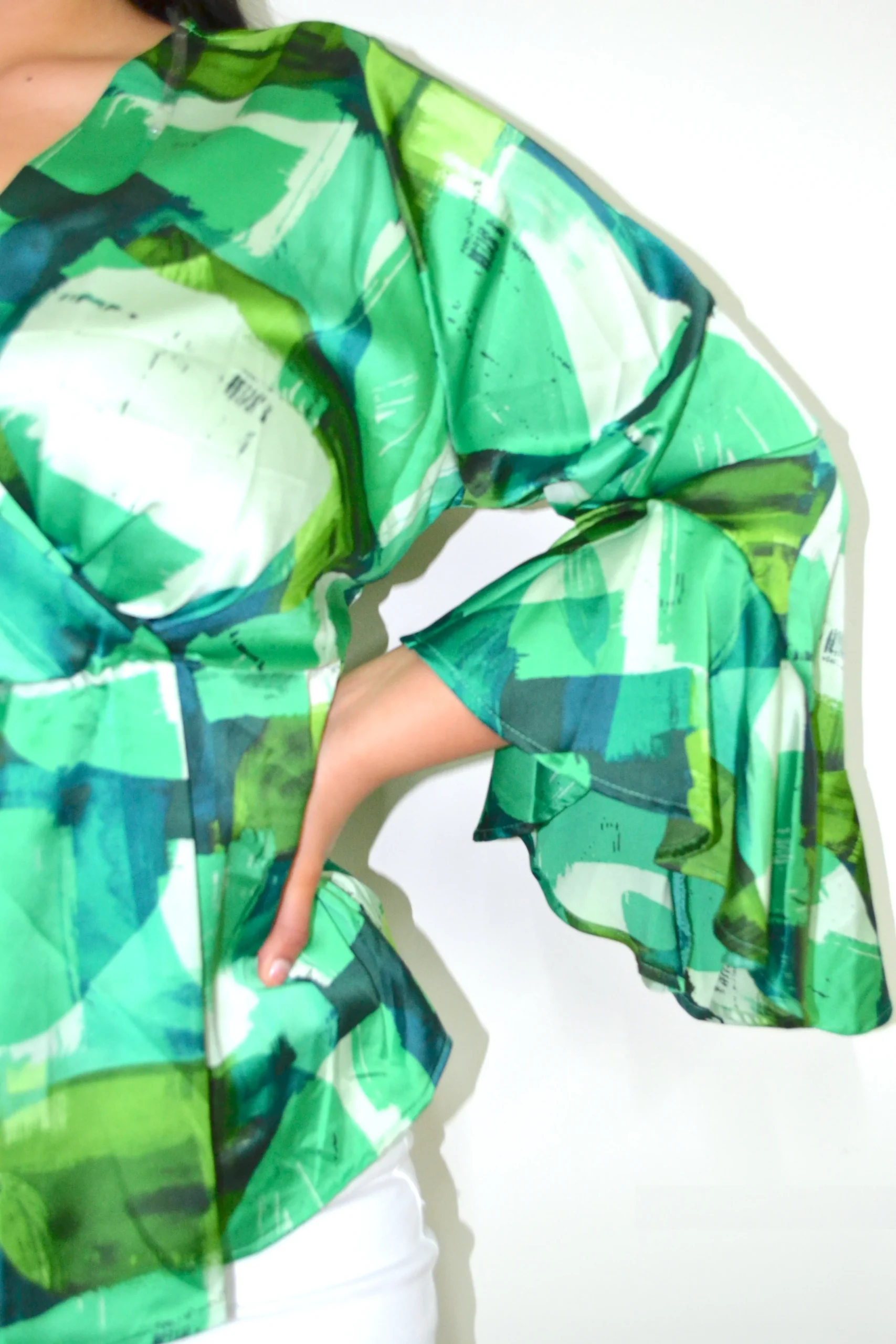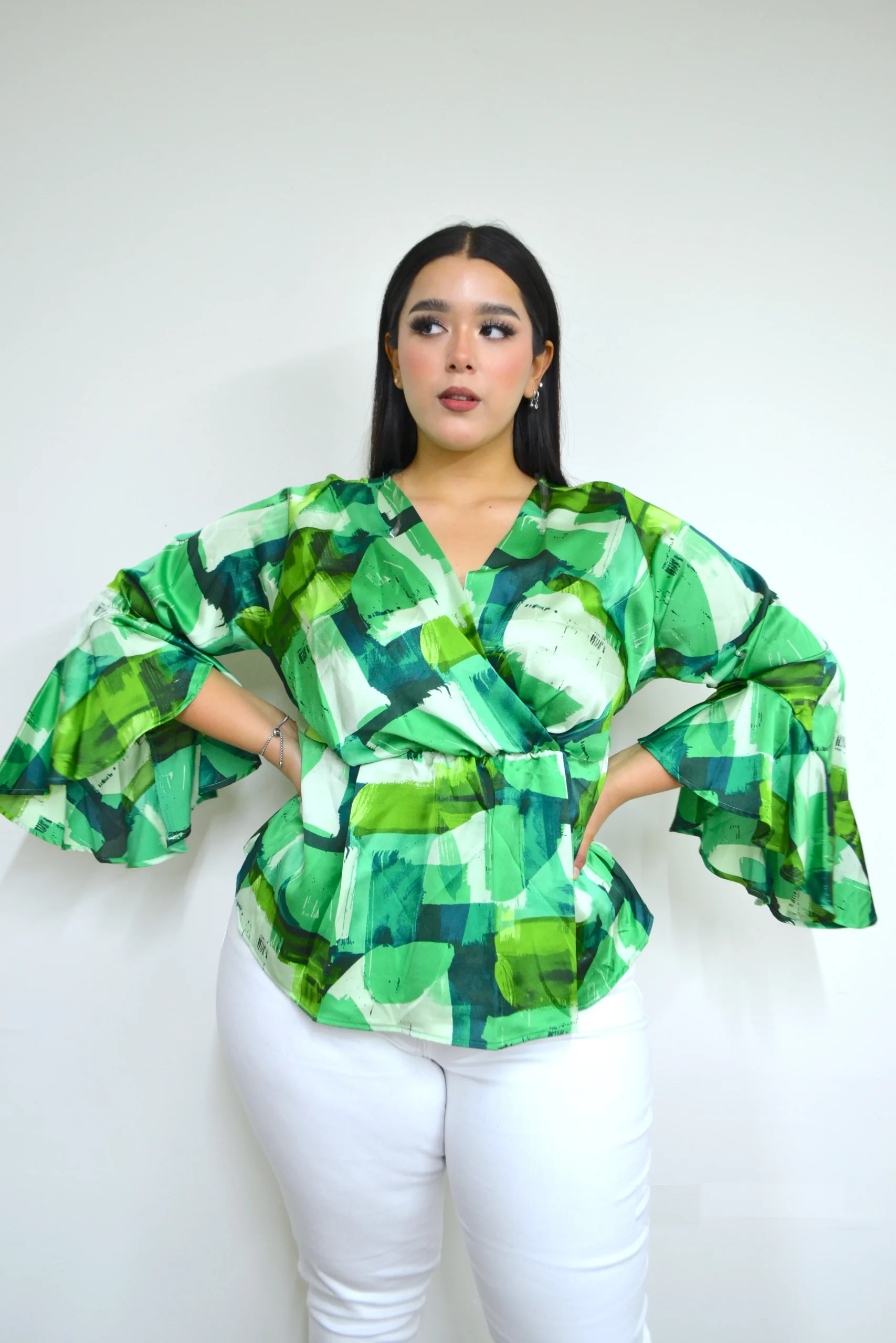 Blusa estampada corte pemplum con diseño estampado en varios tonos, dándole un toque súper cool, modelo manga larga asimétrica tipo campana, cuello en escote V, tela satinada súper fresca y con nivel de stretch de medio a alto.
