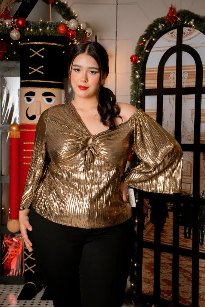 Blusa de fiesta estilo metálico, modelo manga larga ligeramente efecto murciélago, con cuello v , blusa en tela fresca con nivel de stretch de medio a alto.