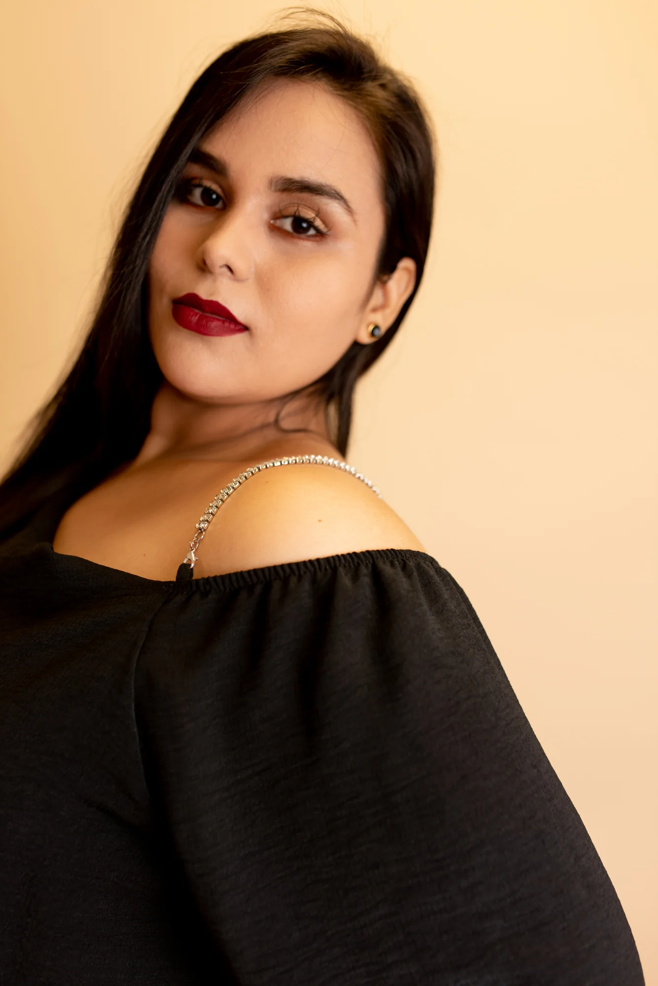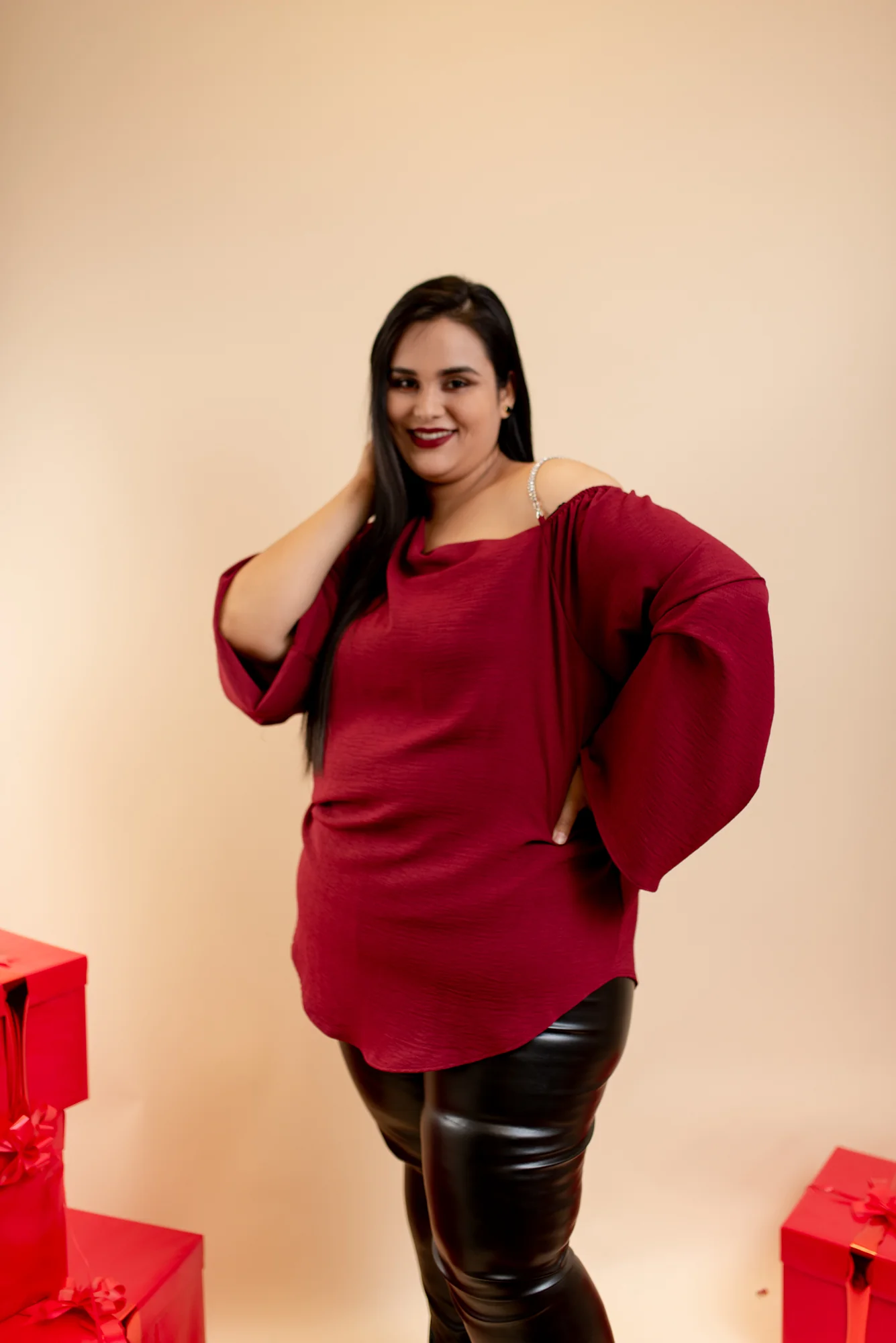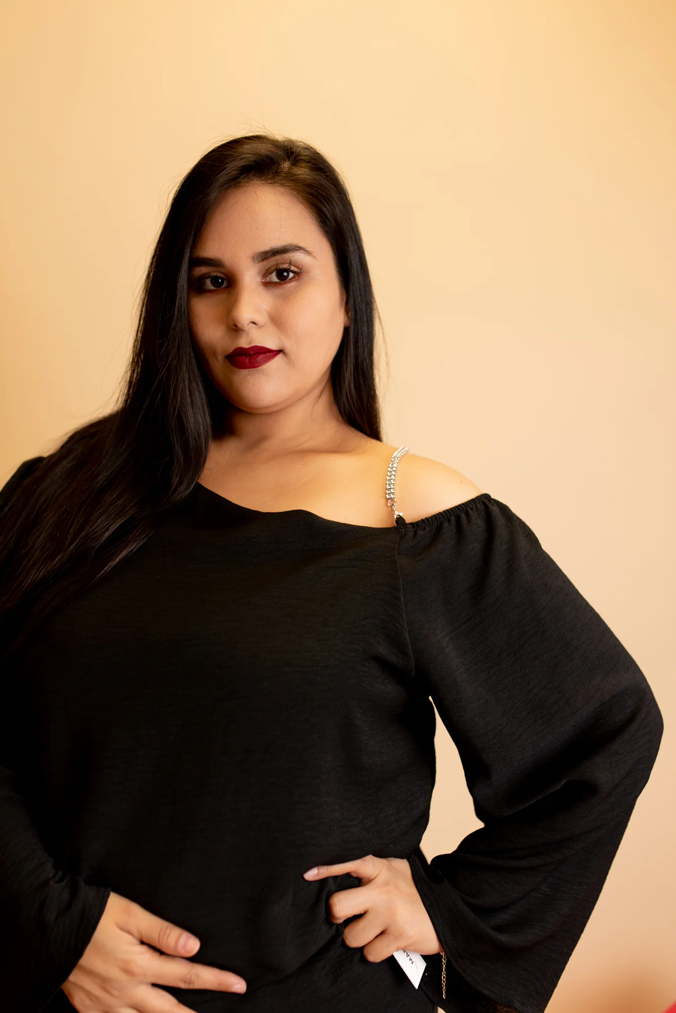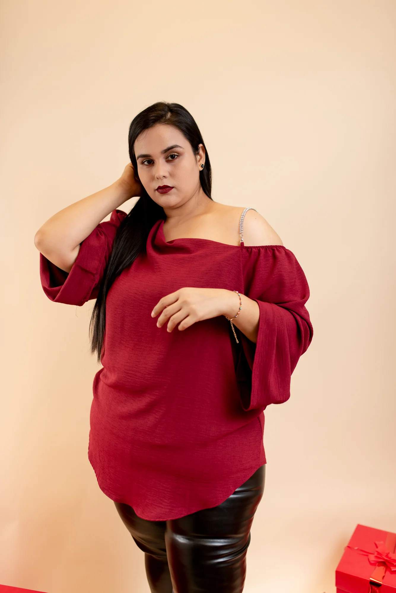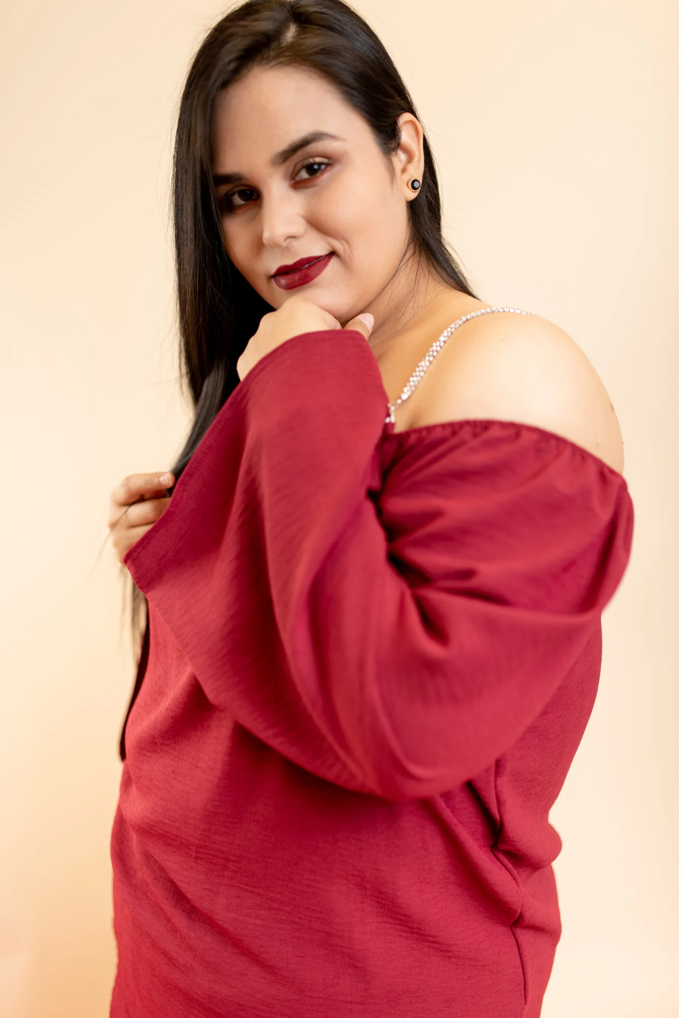 Blusa fiesta, modelo manga larga estilo campana, con escote al hombro izquierdo con tirante de pedrería, cuello redondo con caída.