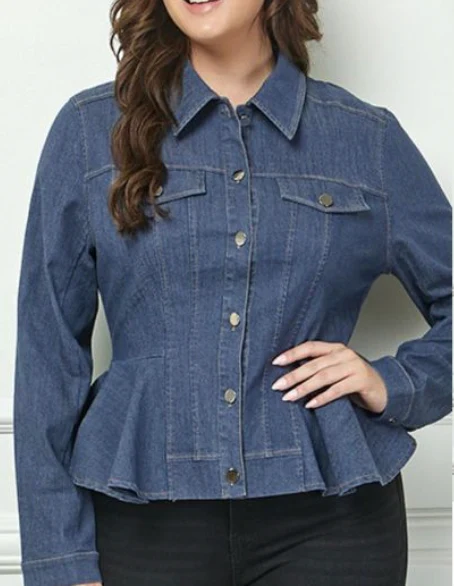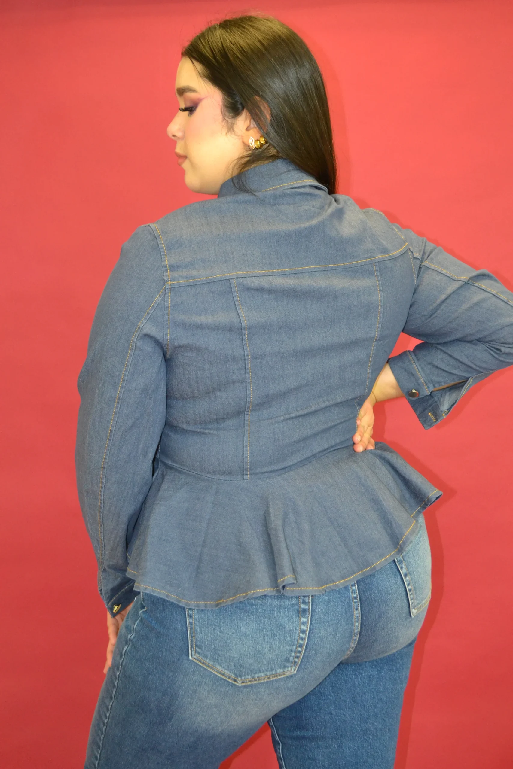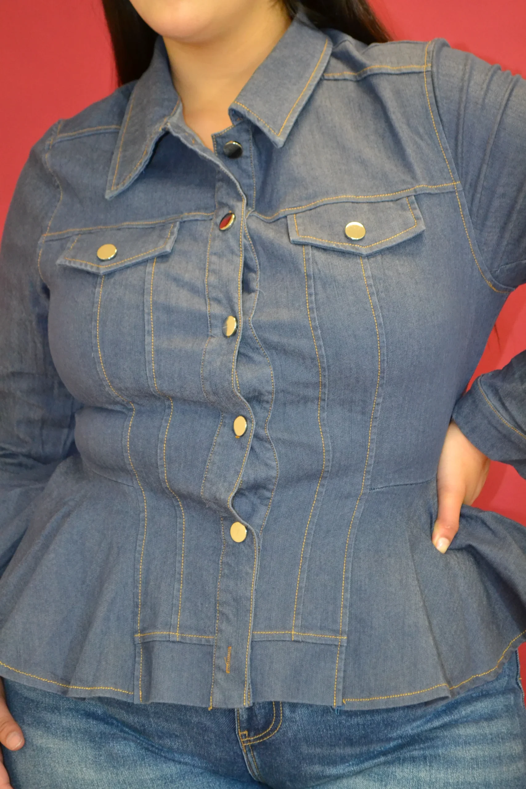Blusa corte camisera en tela de mezclilla super fresca, modelo manga larga corte pemplum, cuello mao clásico con bolsa en la parte frontal, nivel de stretch de medio a alto.