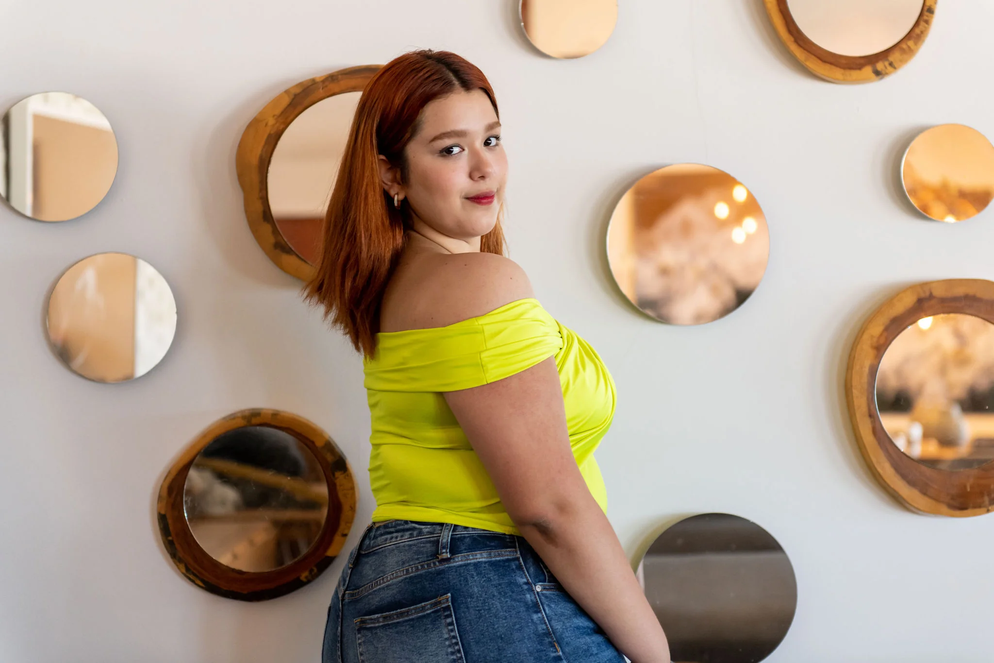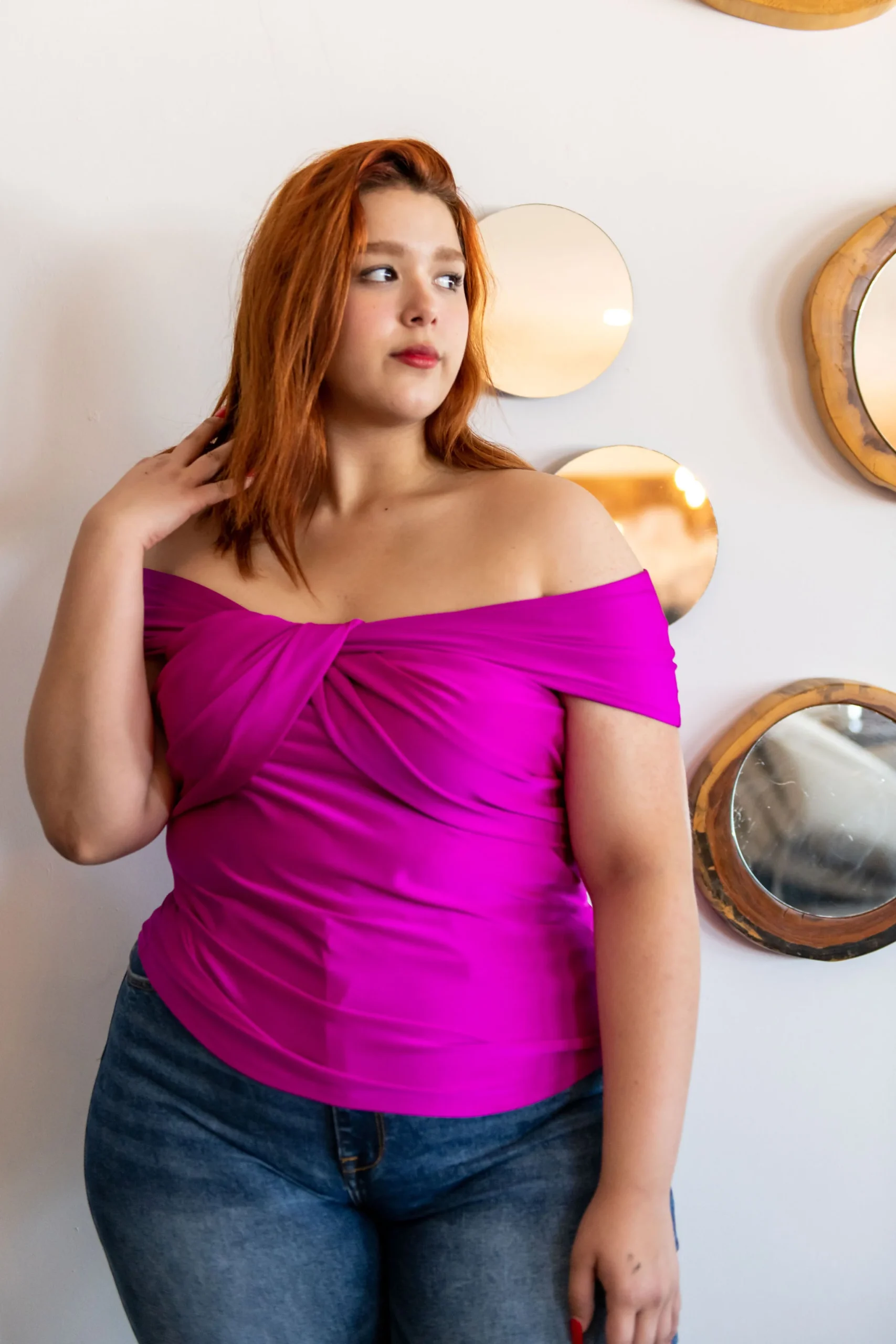 Blusa estilo satin de licra con escote off the shoulder, de corte largo, manga cortita a los hombros, cuello escote V, con nivel de stretch de medio a súper alto.