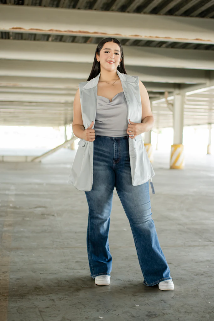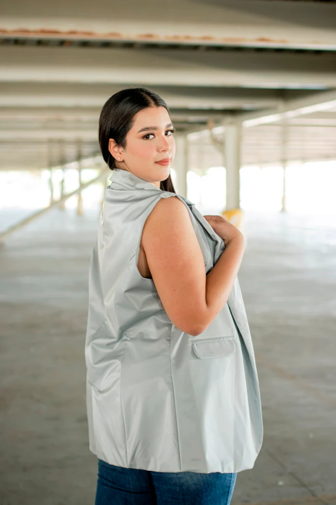 Chaleco efecto brillo de moda, modelo cuello clásico, corte semi corto con simulación de bolsas, ideal para hacer relucir tu outfit.