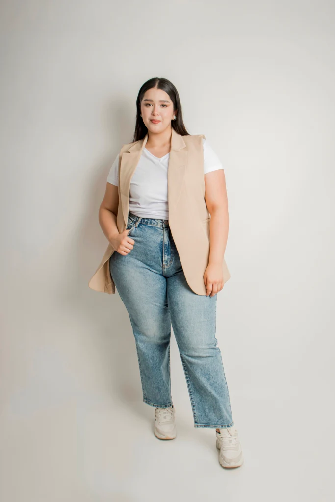 Nuestra modelo viste talla 40, es decir 2XL.