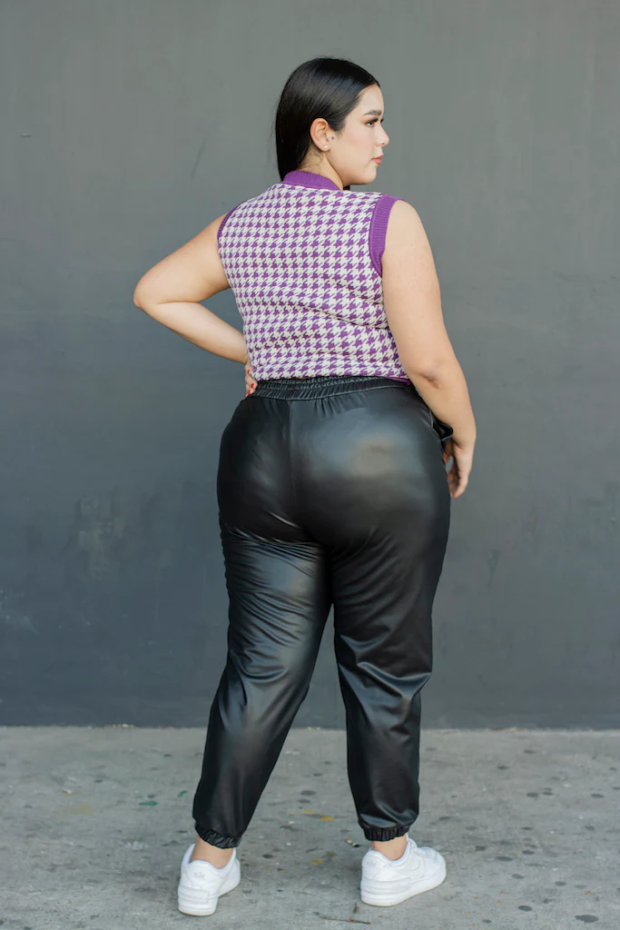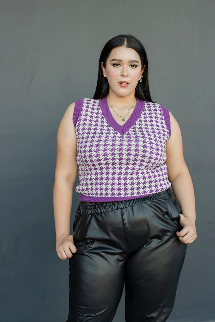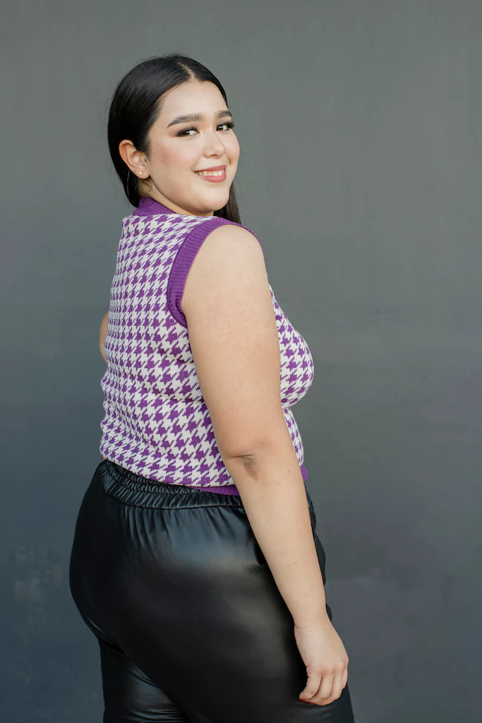 Chaleco tejido, modelo cuello V, corte semi corto con estampado pata de gallo , ideal para hacer relucir tu outfit.