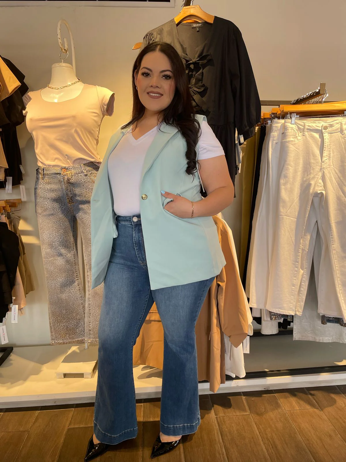 Nuestra modelo Daniela viste talla 40, es decir 2XL.