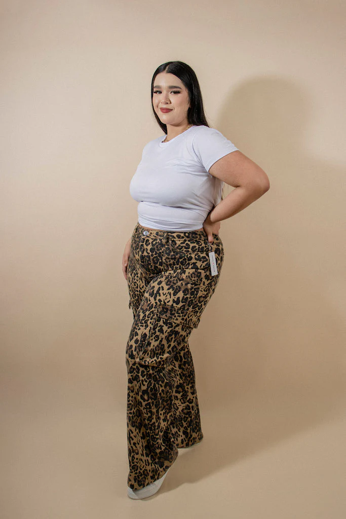 Jeans Cargo Animal Print, modelo wide tiro alto corte recto y bolsas laterales, con de costura al frente, con nivel de stretch de bajo a medio, con cierre al costado.