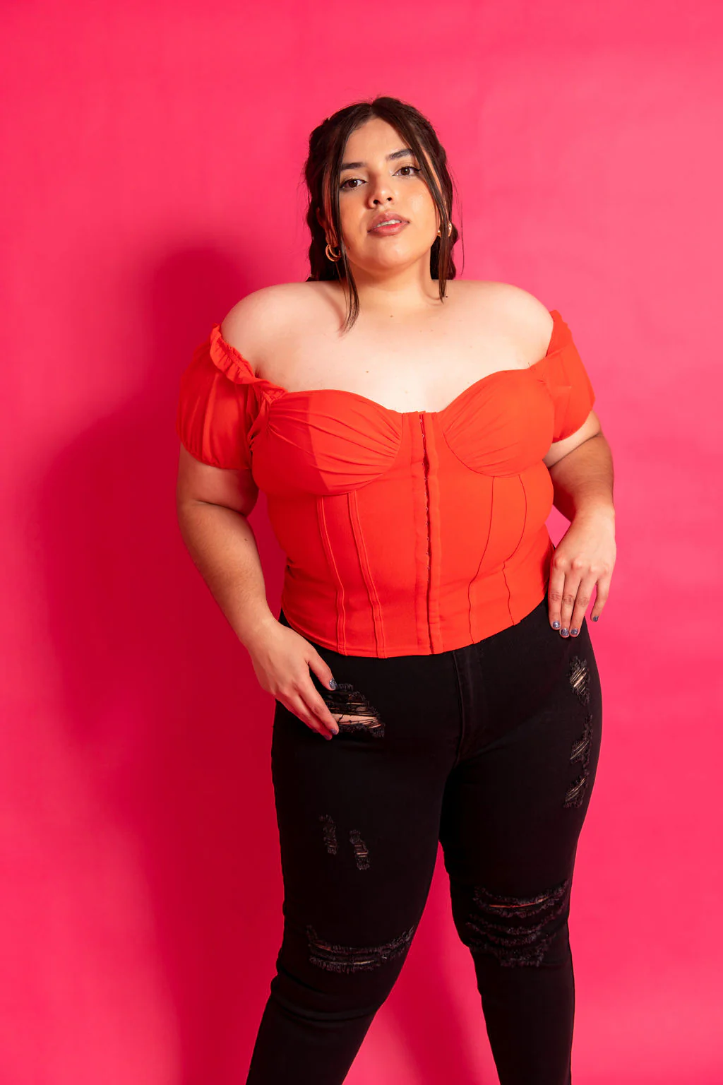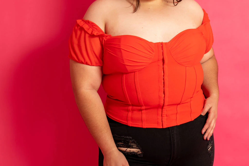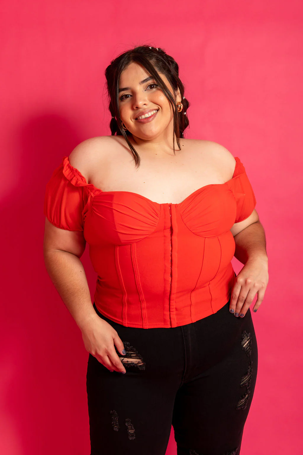 Nuestra modelo Jocelyne viste talla 40, es decir 2XL.
