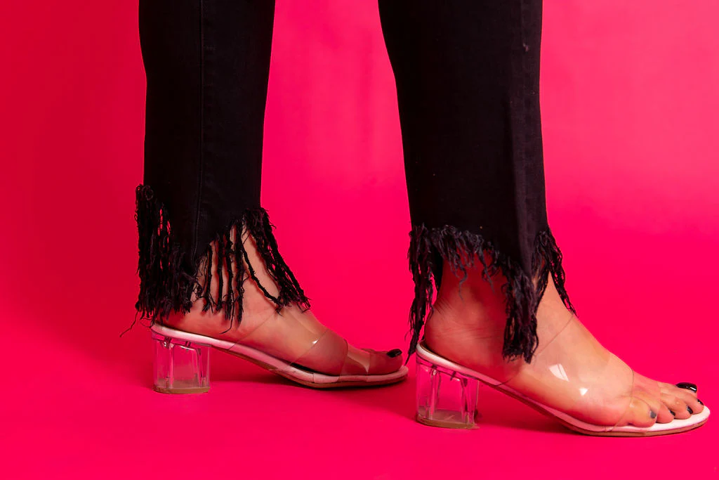 Jeans mezclilla en color negro de tiro alto con pronunciadas roturas principalmente en la parte de abajo estilo deshilachado, modelo de cinco bolsas cierre y botón, nivel de stretch súper alto FAVORECEDOR e ideal para lucir ESPECTACULAR.