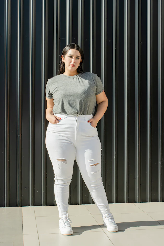 Jeans estilo skinny con roturas en la parte de las rodillas, diseño en color blanco, con detalles en la parte superior, modelo de cinco bolsas, cierre y botón.