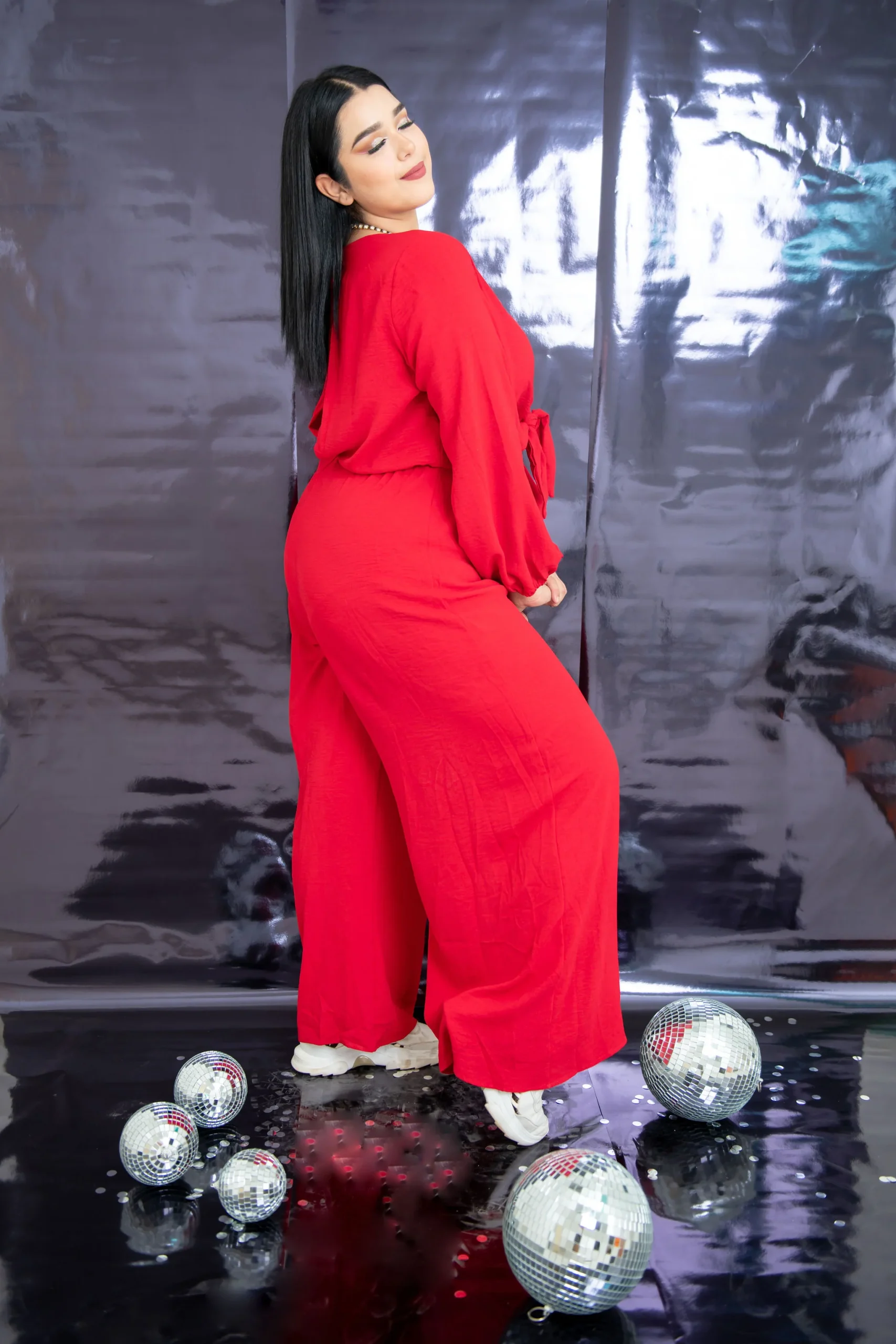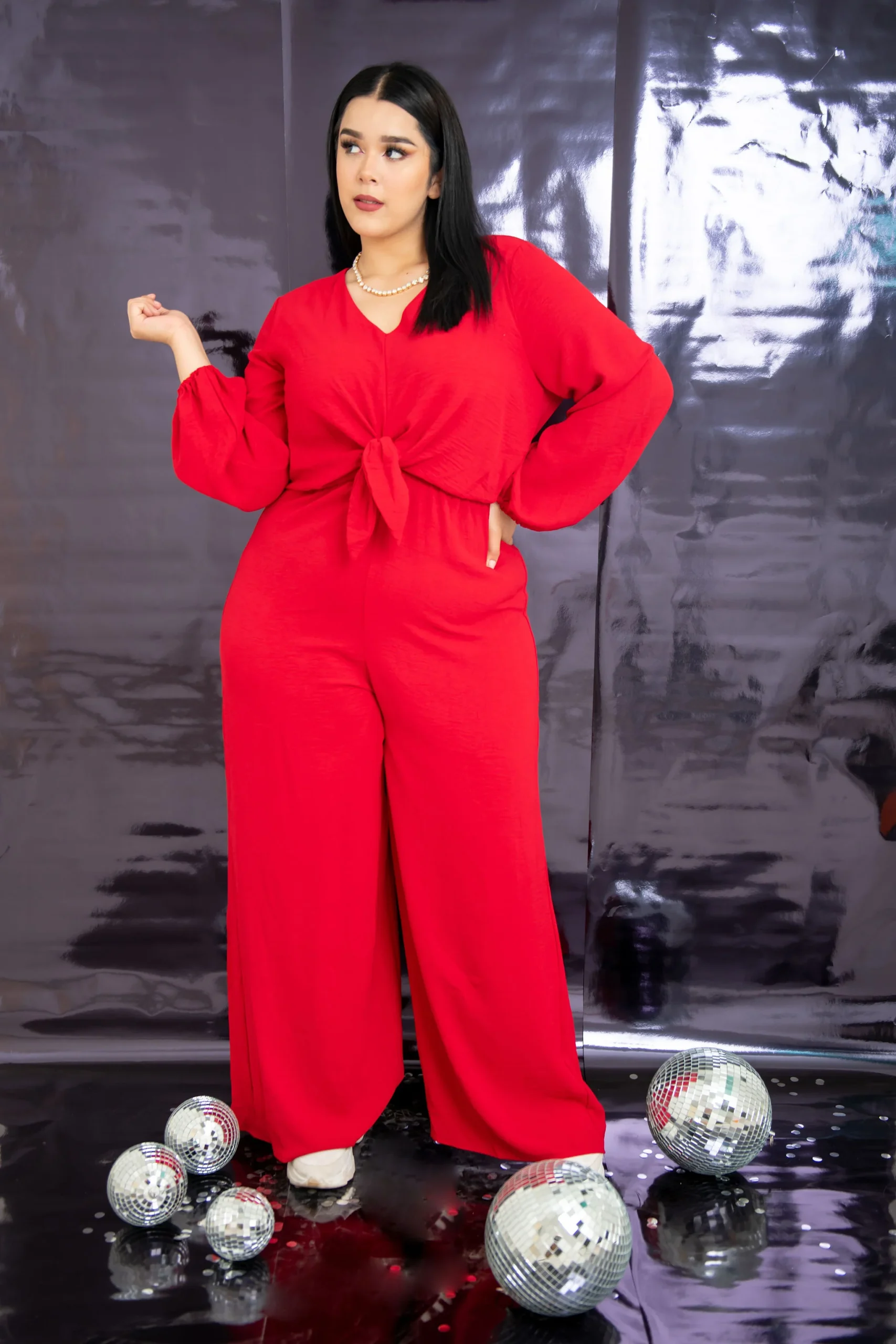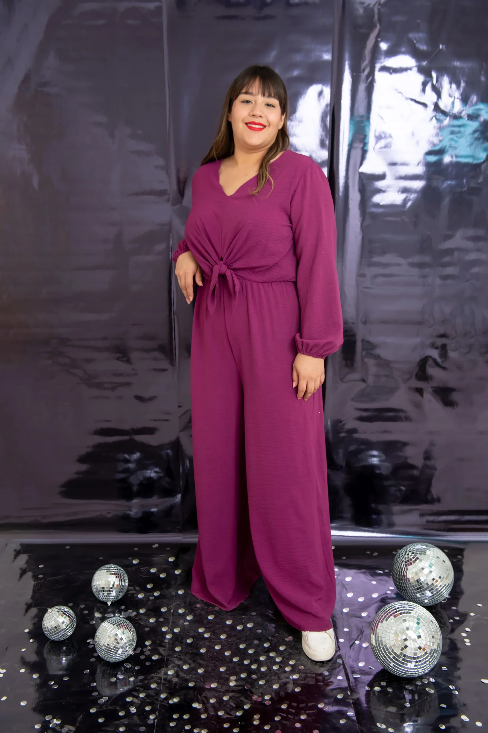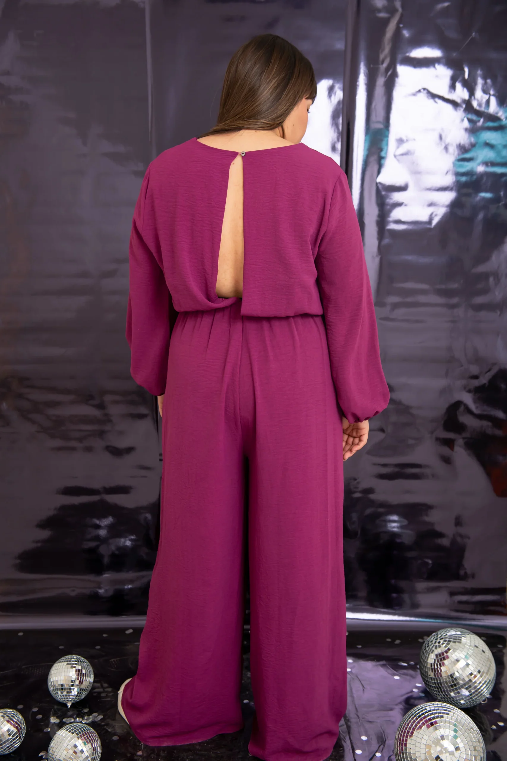 Jumpsuit palazzo de fiesta, modelo liso de manga larga tipo abullonada, con cuello en V y detalle de nudo al frente, abertura en la parte de atrás efecto escote en espalda con botón superior. Corte de pantalón acampanado «FLARE», jumpsuit súper en TENDENCIA.