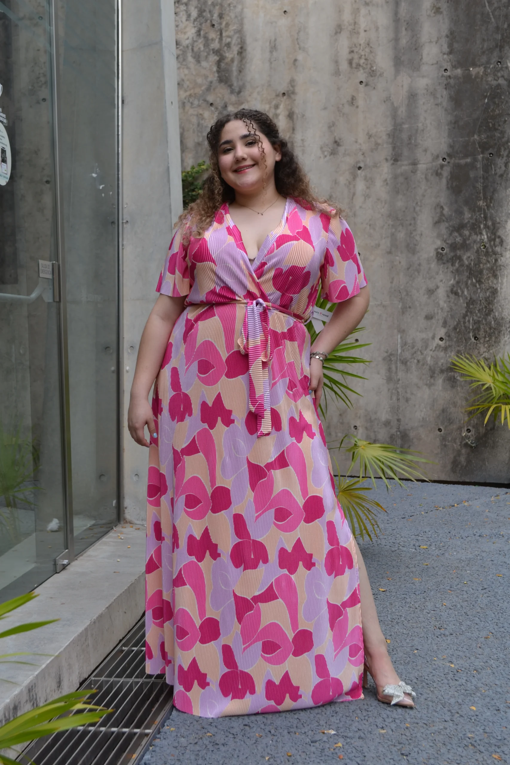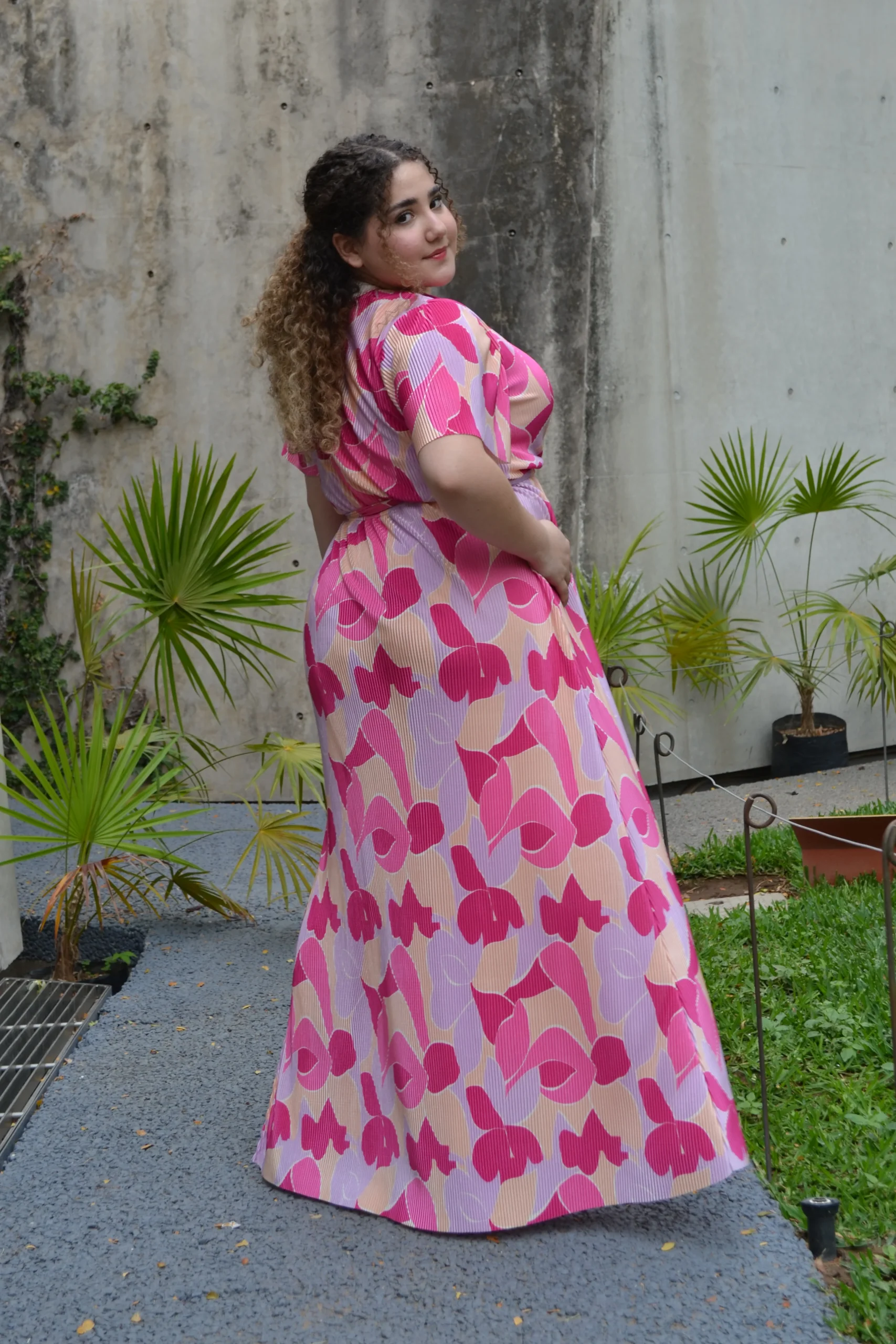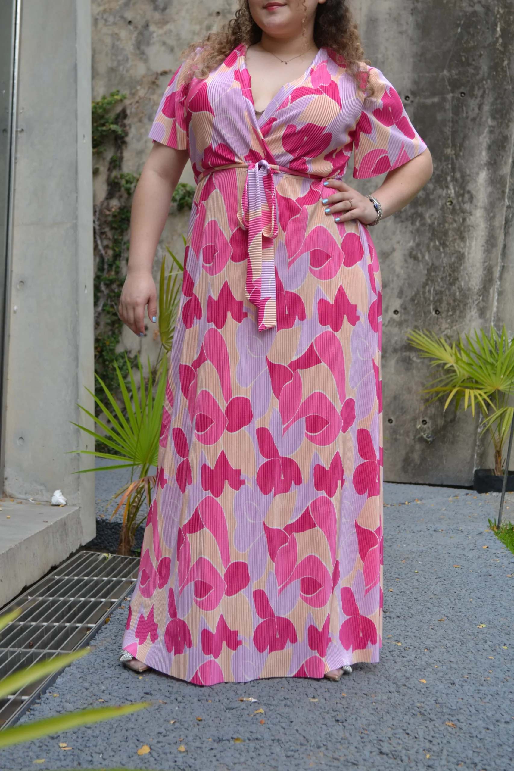 vestido largo de fiesta estampado gráfico tonos verdes y rosas con fondo lima, modelo manga 3/4 y cuello en escote V, con cierre en la parte tracería dando un toque más elegante, ideal para lucir fresca, comoda y ESPECTACULA R.