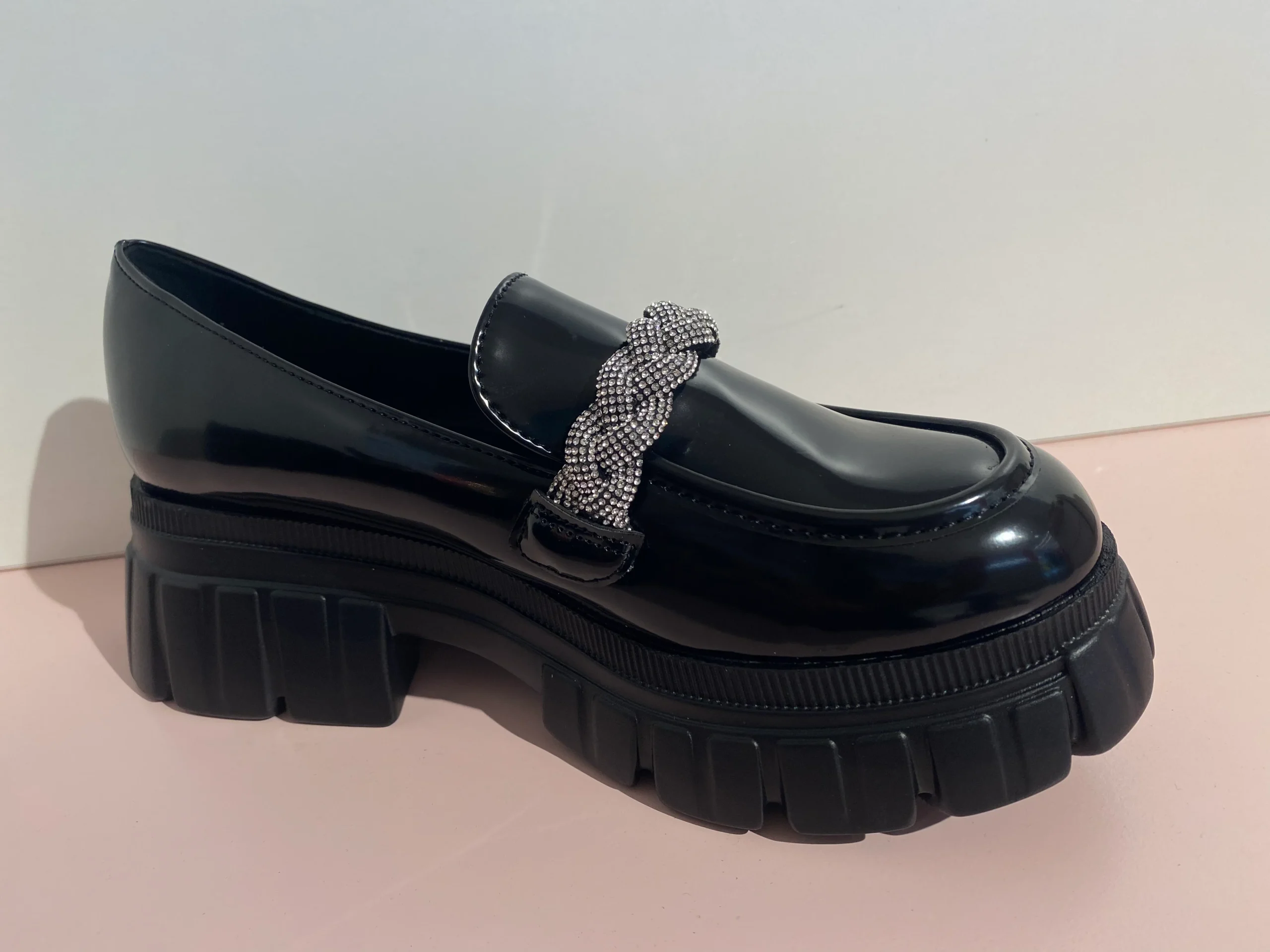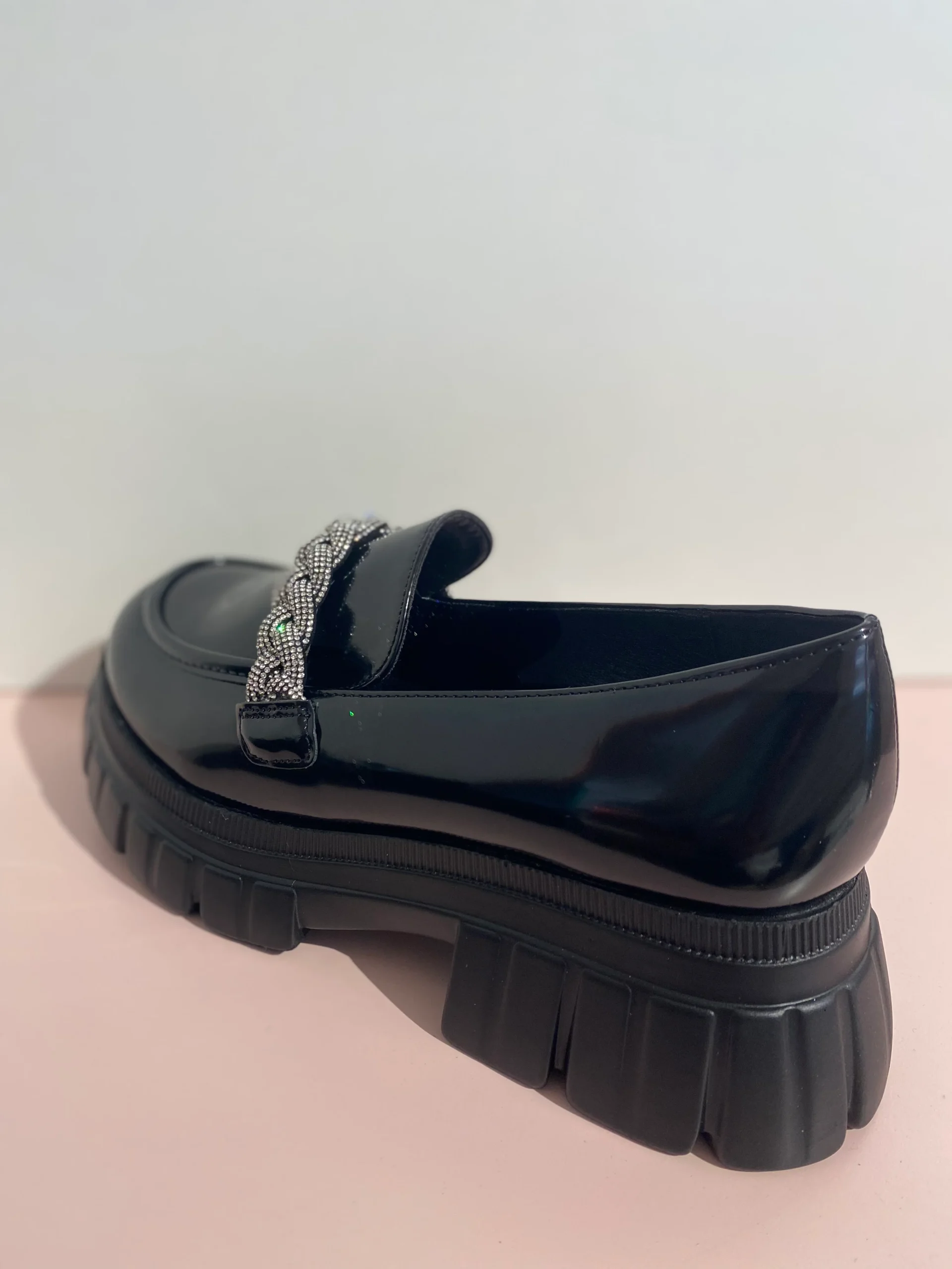 Mocasin efecto piel con tipo hebilla de pedrería, con diseño de suela y parte alta de color negro, súper cómodos de llevar e ideal para verte GUAPA y SÚPER COOL con cualquiera de tus outfits.