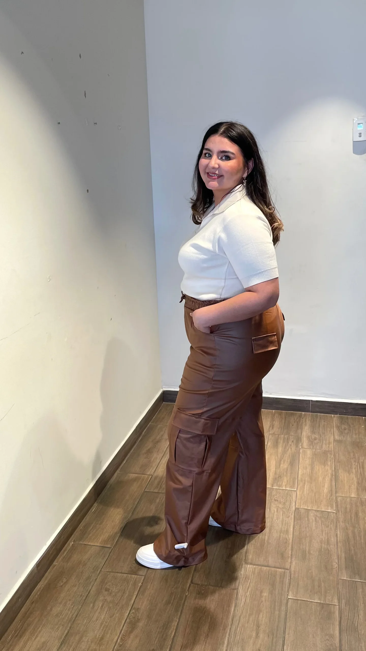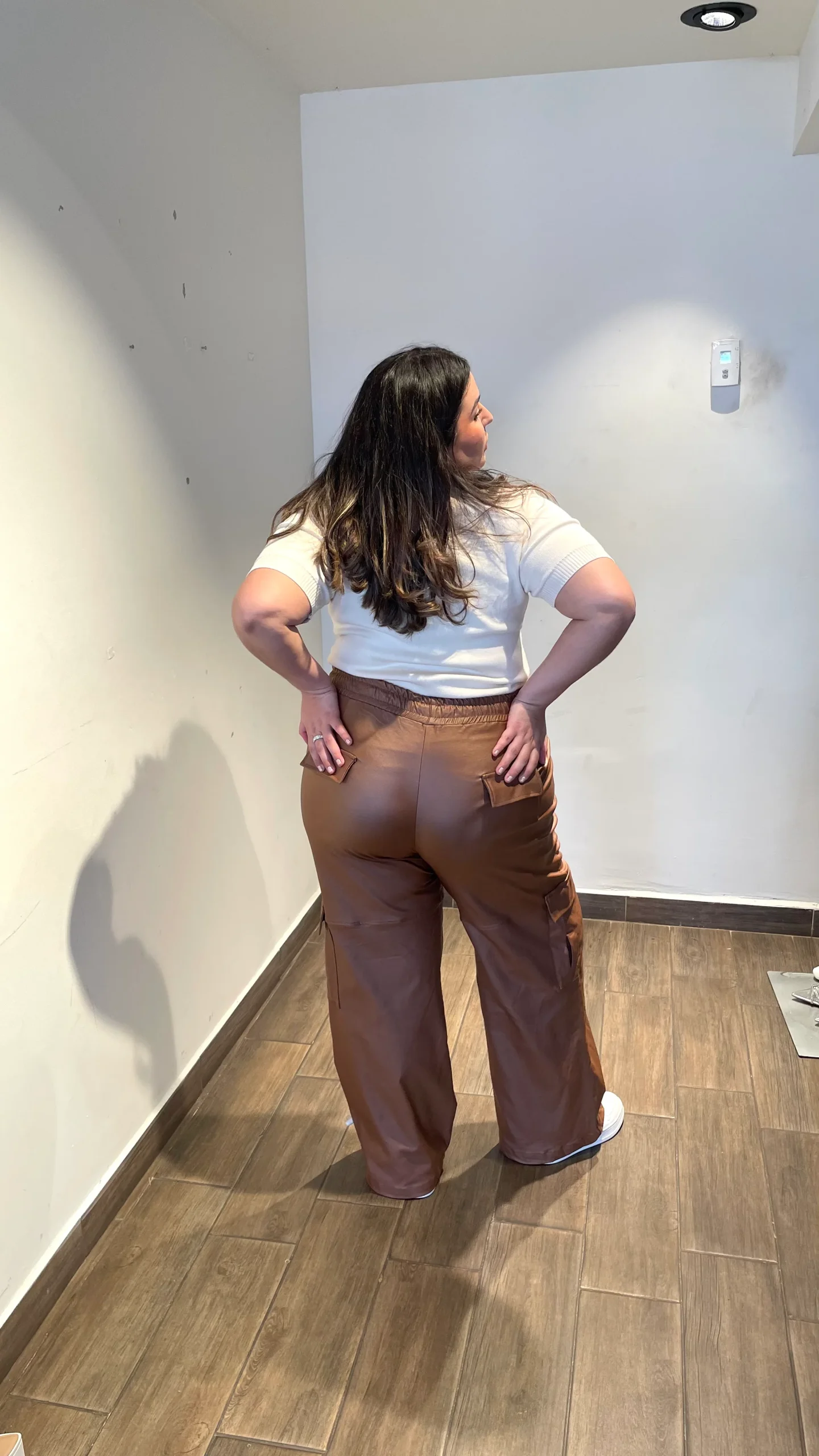Pantalón cargo liso, modelo hasta los tobillos, estilo tiro alto, con nivel de stretch de medio a alto EFECTO VINIPIEL, modelo con bolsas a los lados, cierre y botón.