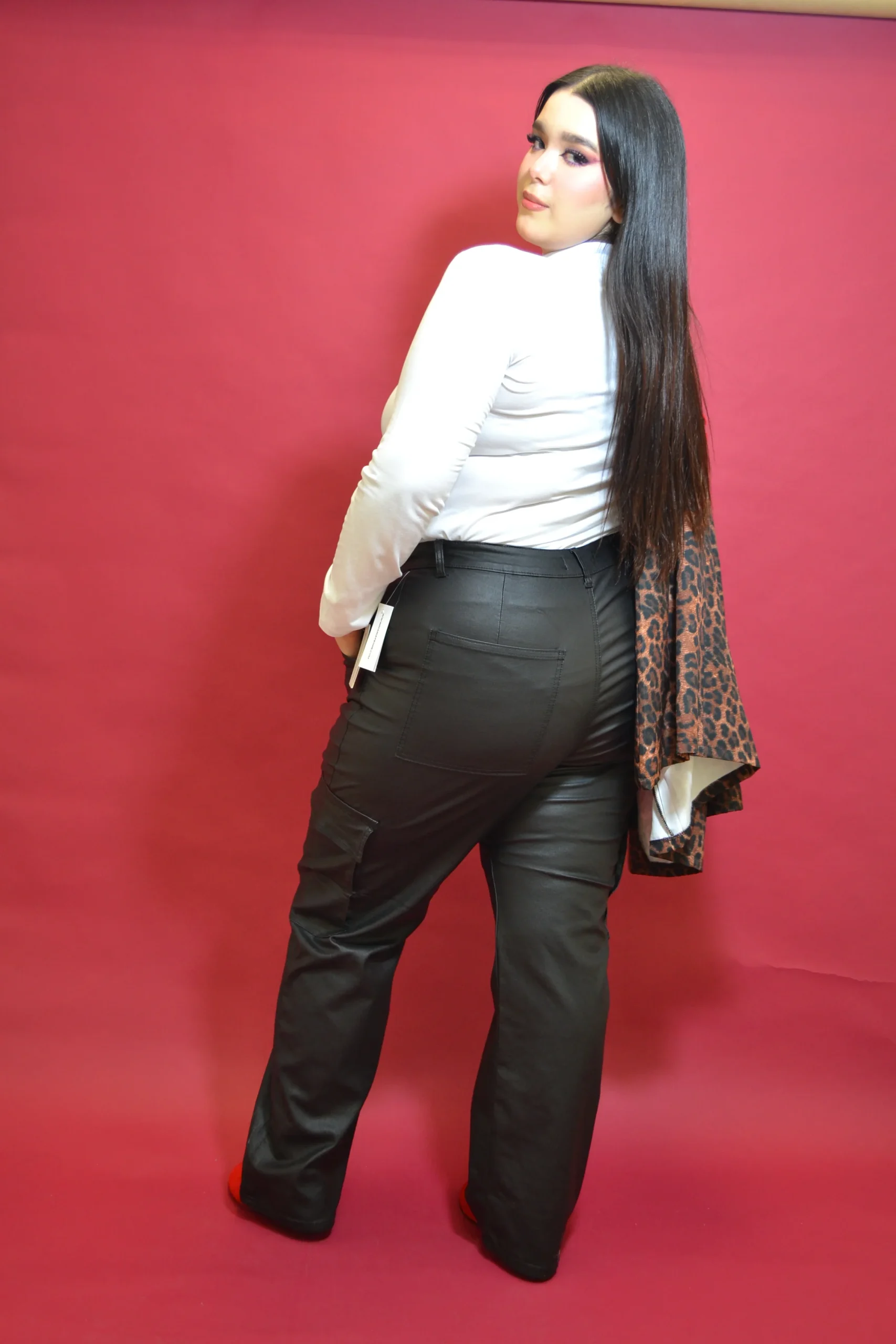 Pantalón cargo liso, modelo hasta los tobillos, estilo tiro alto, con nivel de stretch de medio a alto EFECTO VINIPIEL, modelo con bolsas a los lados, cierre y botón.
