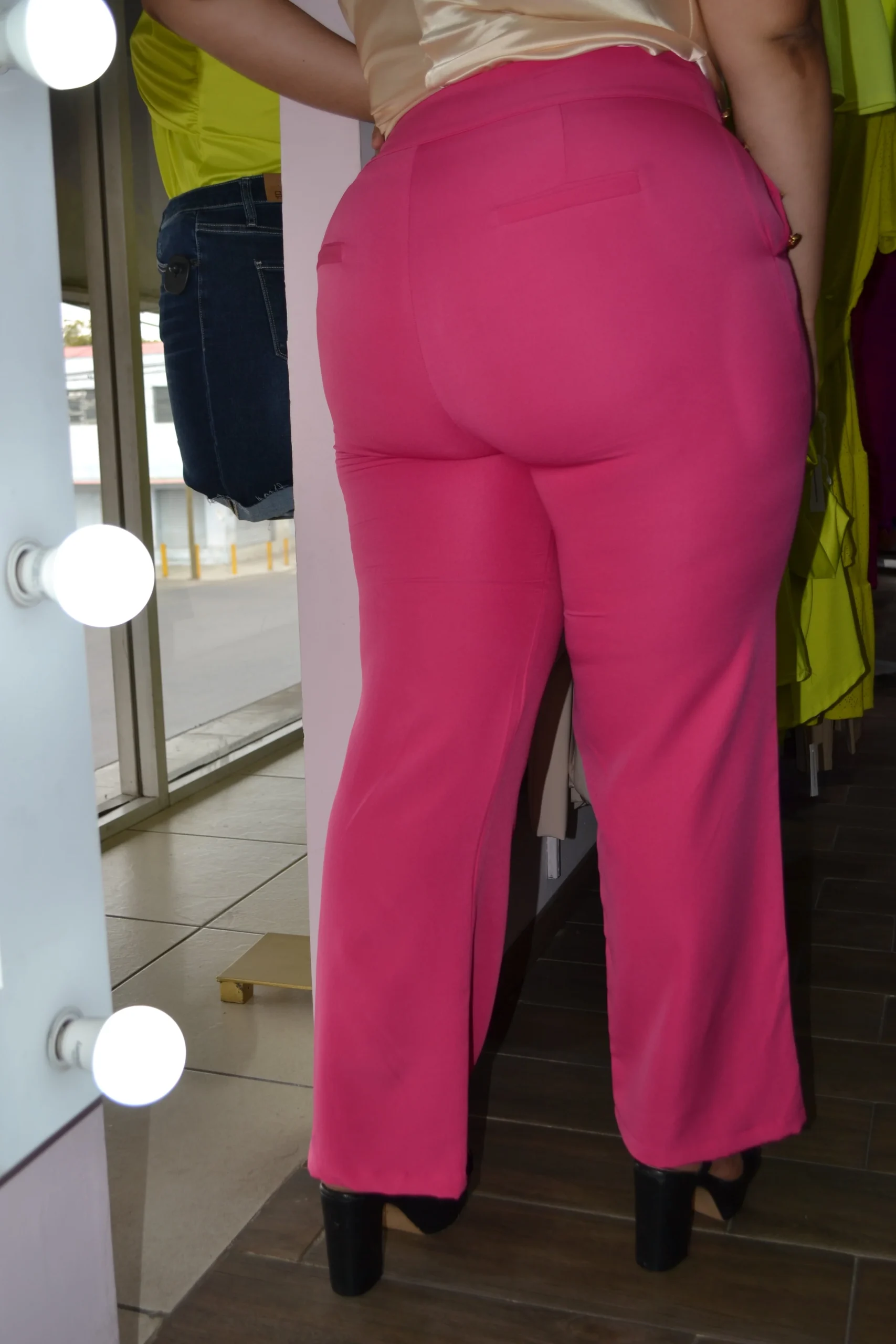 Pantalón de vestiro con cuatro botones color dorado en la parte lateral de ambos lados, pantalón de corte recto semi acampanado, modelo de cierre y botón con bolsas al frente y simulación de bolsas en la parte de atrás, nivel de stretch súper alto, ideal para generar un outfit súper llamativo y ESPECTACULAR.