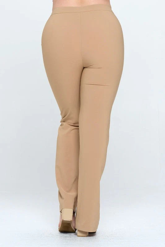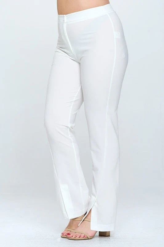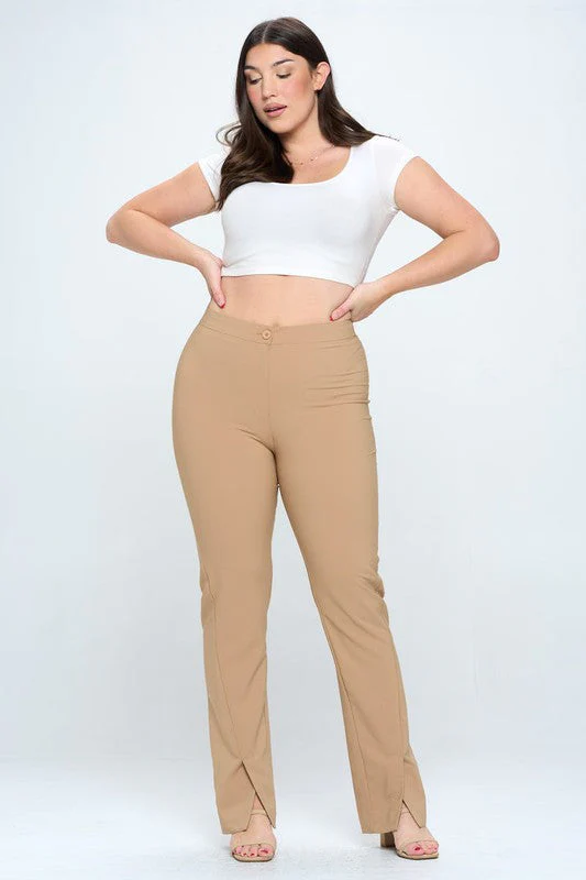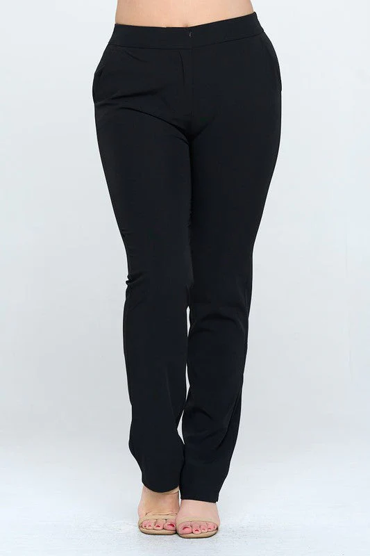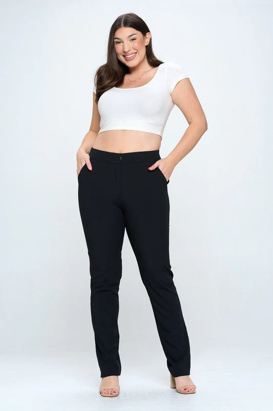 Pantalón moda de vestir, modelo recto de tiro medio alto, con nivel de stretch de medio a alto, estilo de cierre y botón.