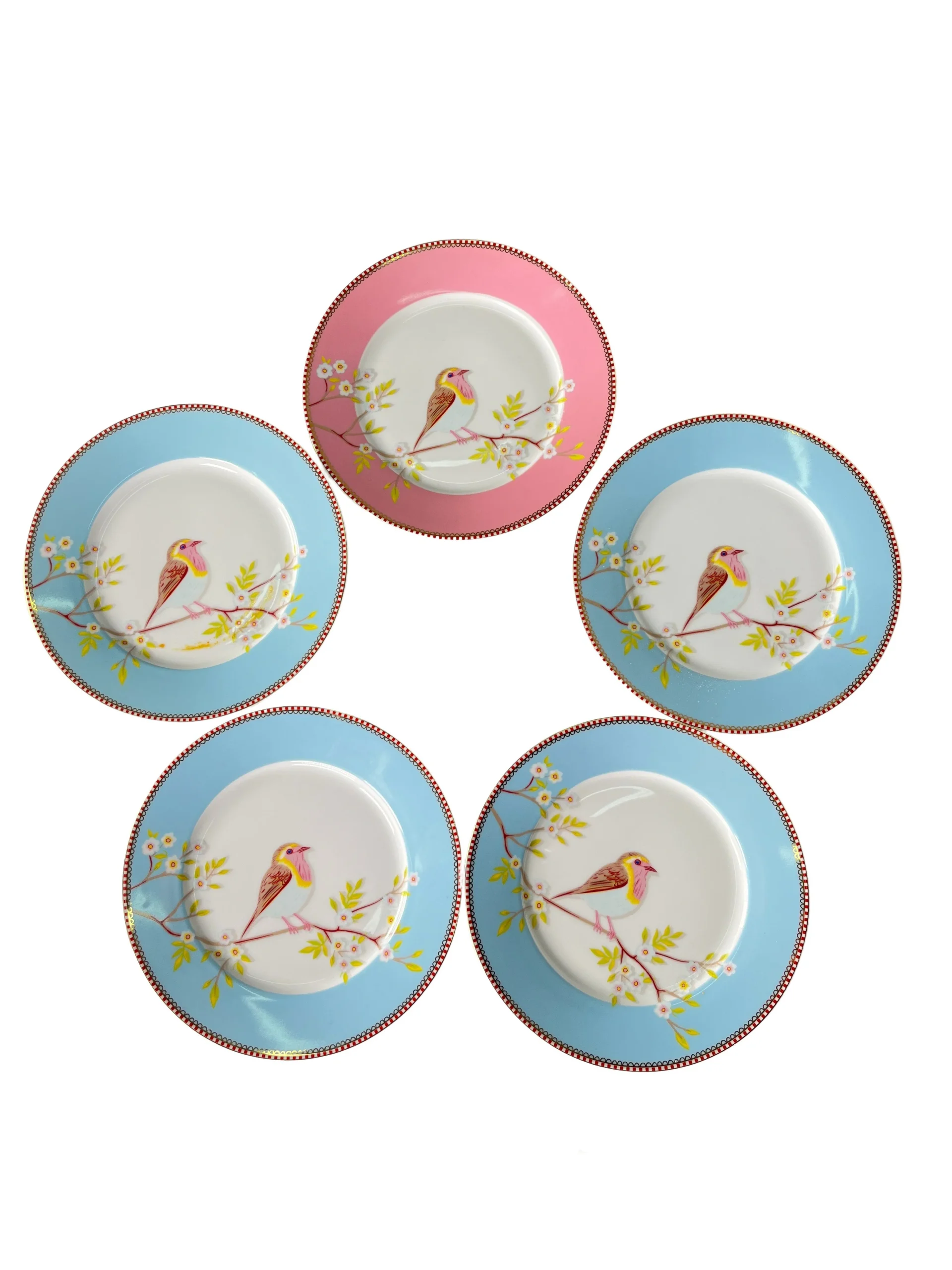 Medida: 21 cm. 4 platos color Celeste y 1 Rosado.