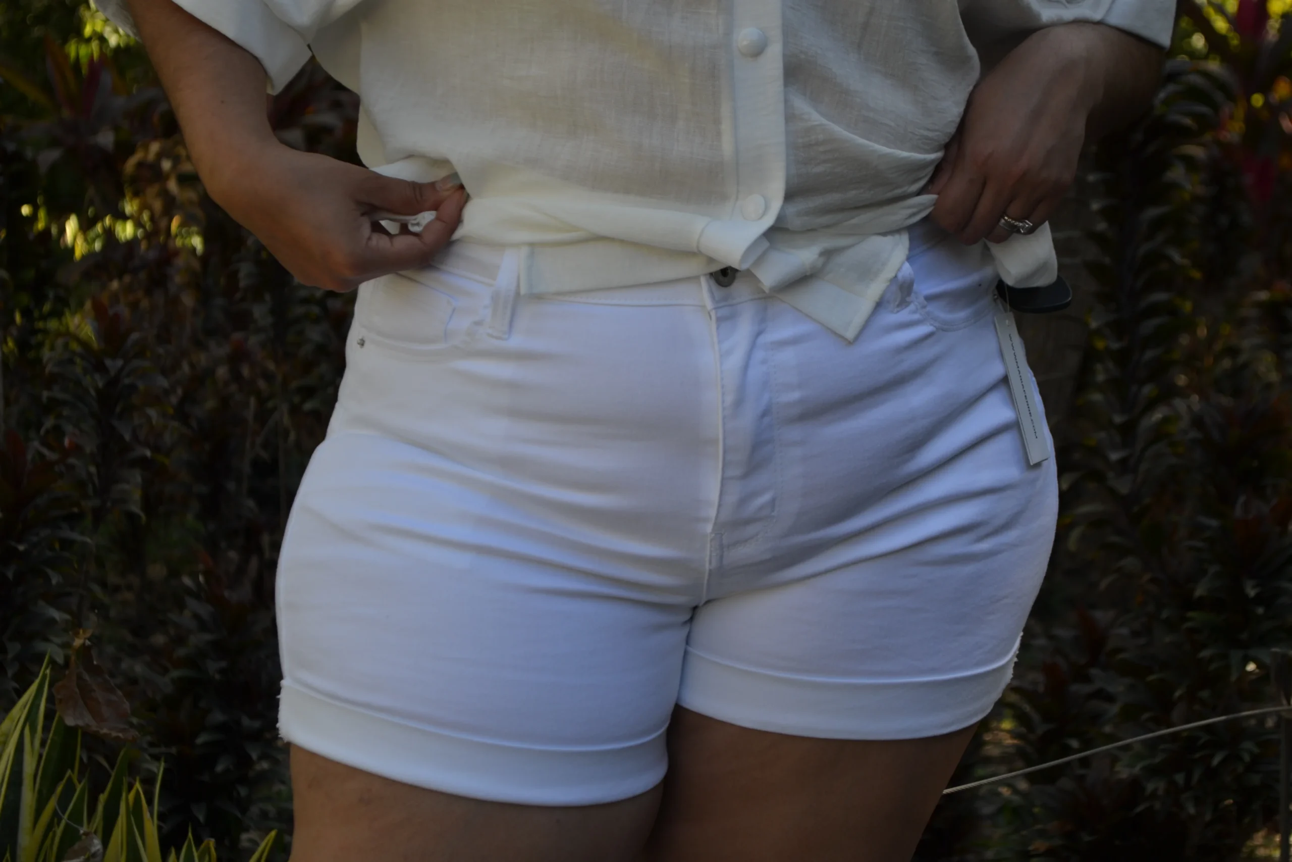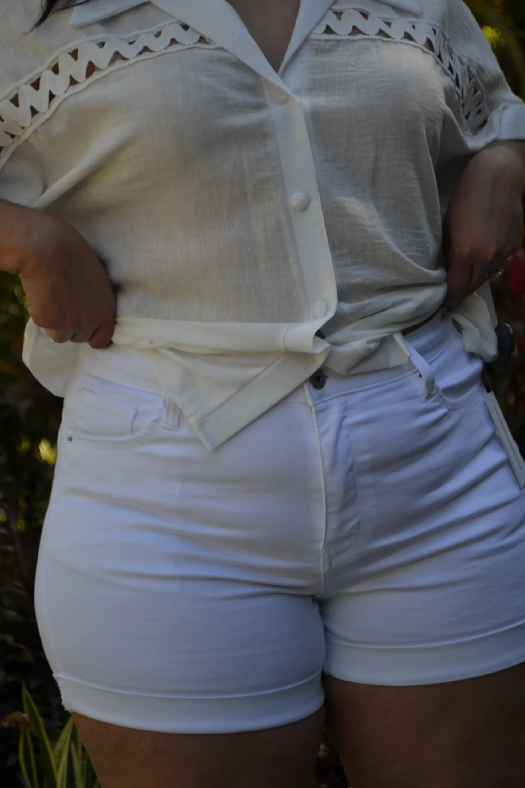 Short biker de mezclilla color blanco , modelo , cierre y botón, semi largo con dobladillo en la parte inferior y estilo deslavado, dándole un toque súper cool.