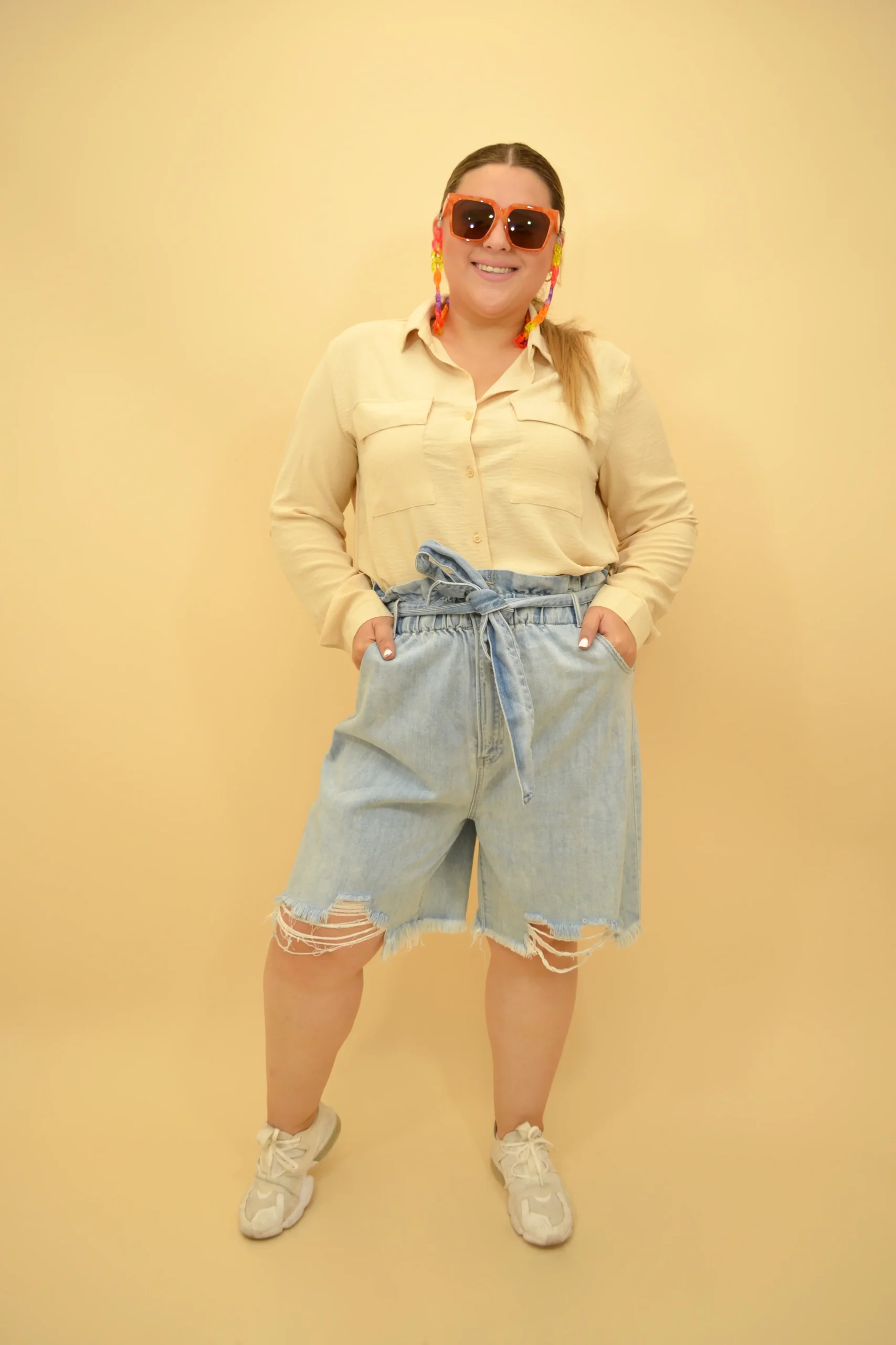 short tipo paperbag, tiro largo, es flojo, tiene diseño deshilachado en toda la prenda baja, tiene 4 bolsas dos enfrente y dos atrás, élastico en la parte de la cintura y boton tamaño mediano.