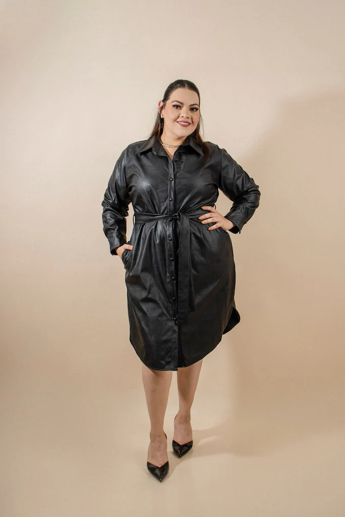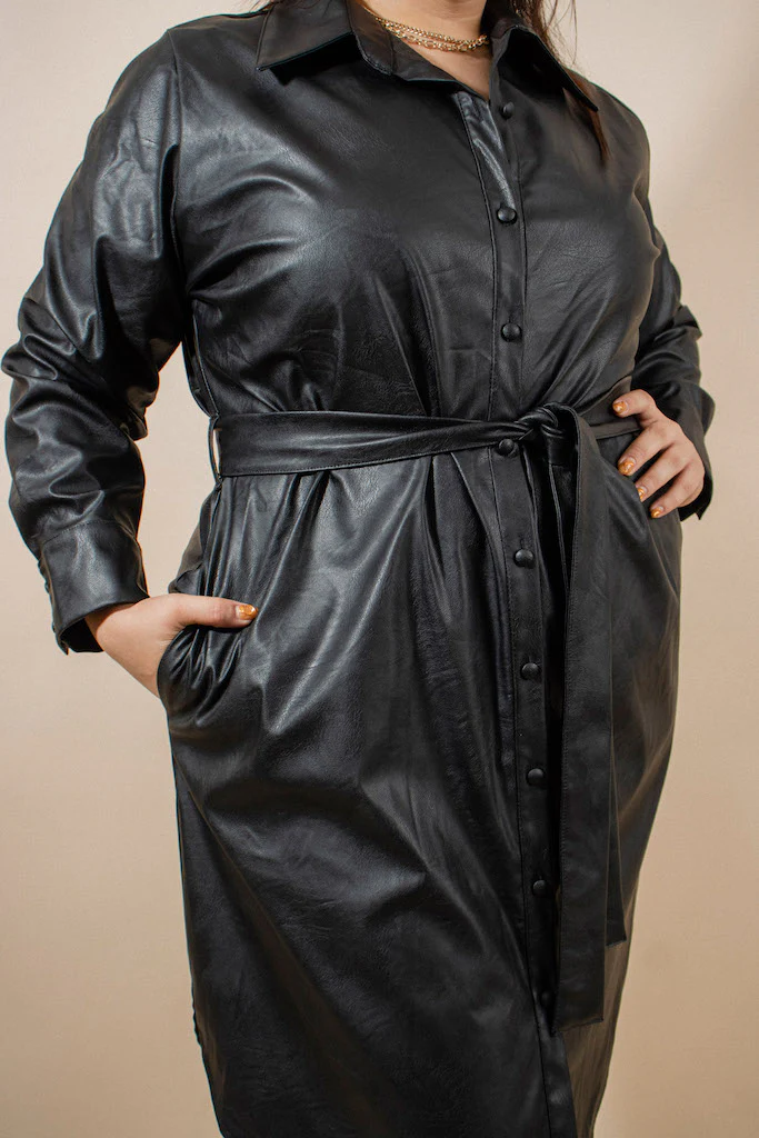 Vestido efecto piel a la rodilla. Modelo con cuello clásico, con botones al frente forrados con la misma tela y laso en cintura de la misma tela. mangas largas estilo camisa y bastilla. Sin forro.