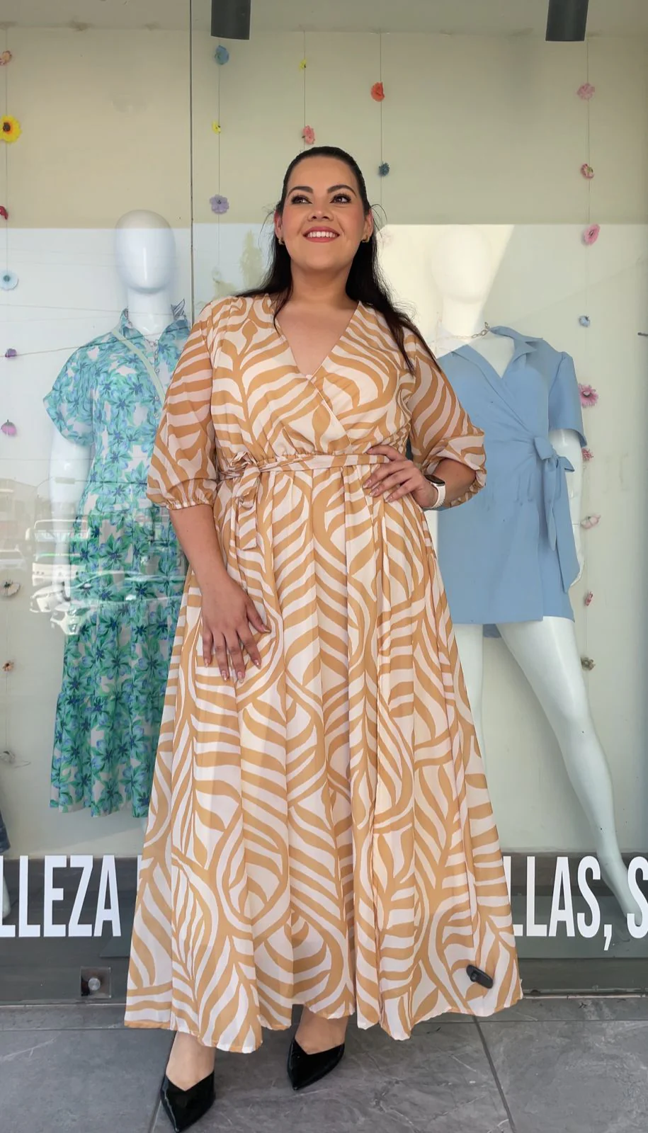 Vestido midi con lazo , modelo manga 3/4 , cuello V , estilo de vestido voladito INCLUYE LAZO AJUSTABLE ideal para lucir fresca, cómoda y al mismo tiempo ESPECTACULAR.