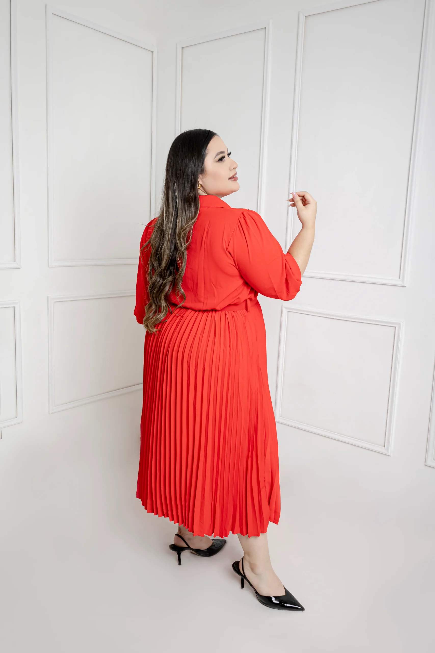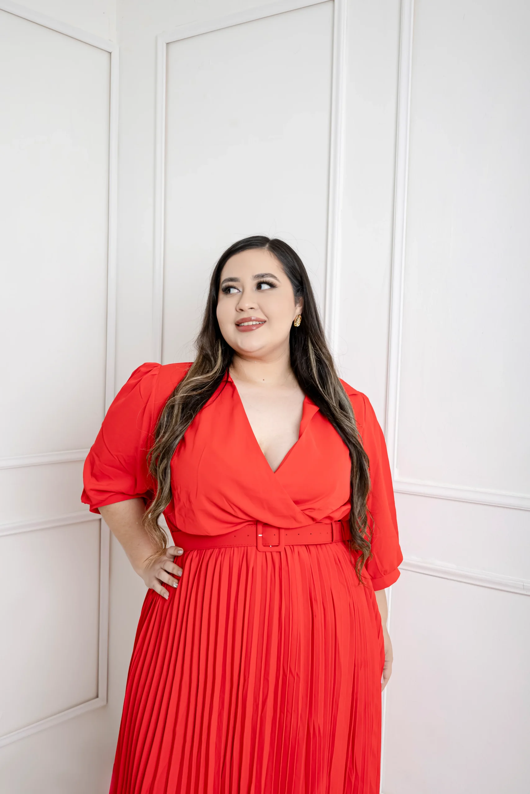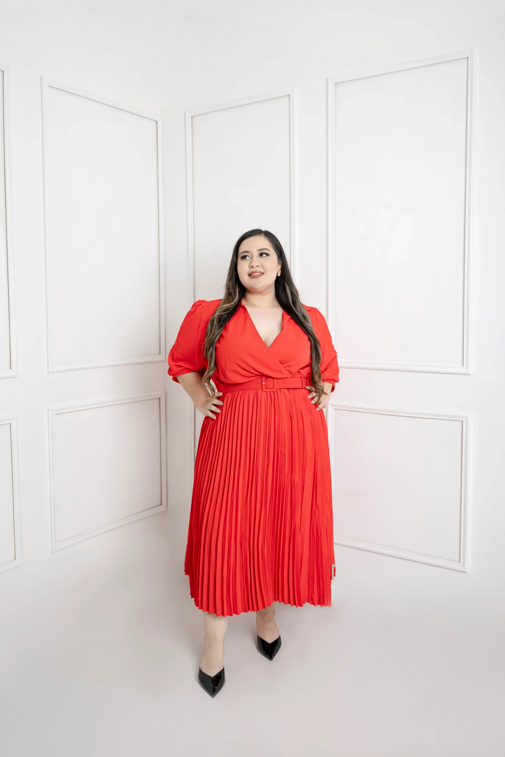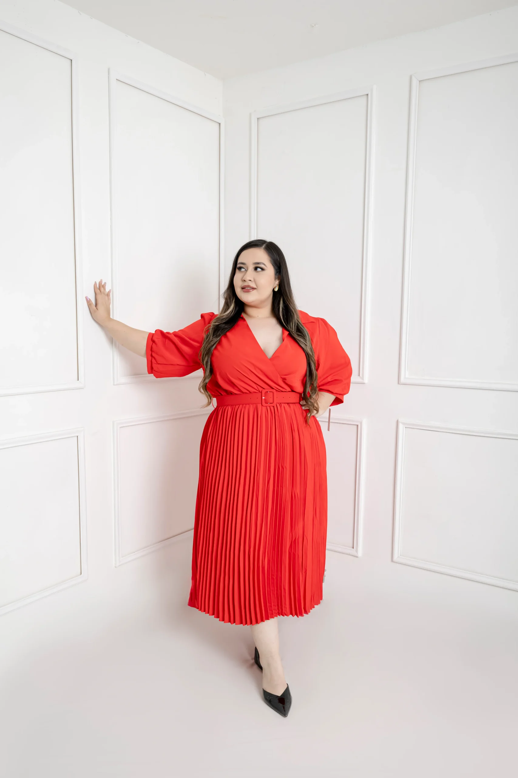 Modelo de vestido corte midi corte plizado de la falda, en escote V con manga 3/4 , con cinto.Diseño liso en color rojo súper cool ideal para lucir un outfit PADRÍSIMO 🥂.D