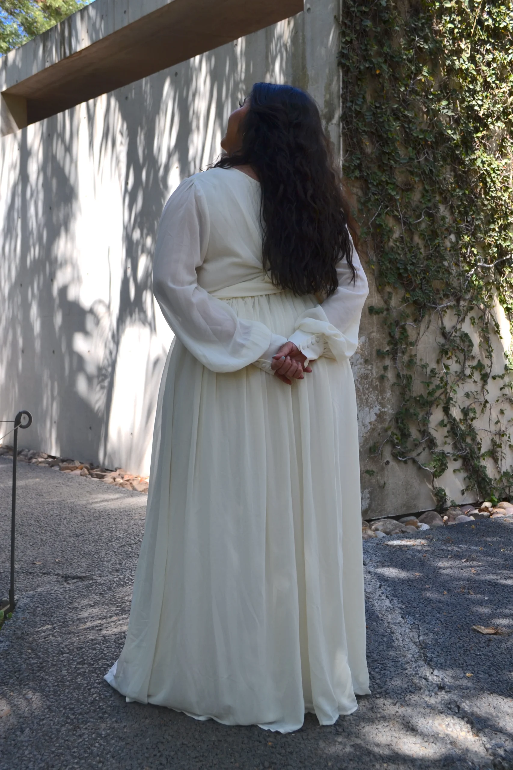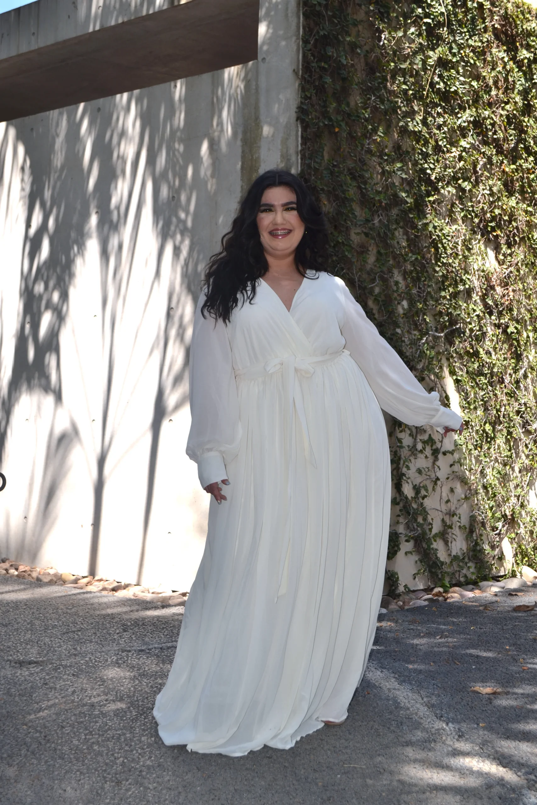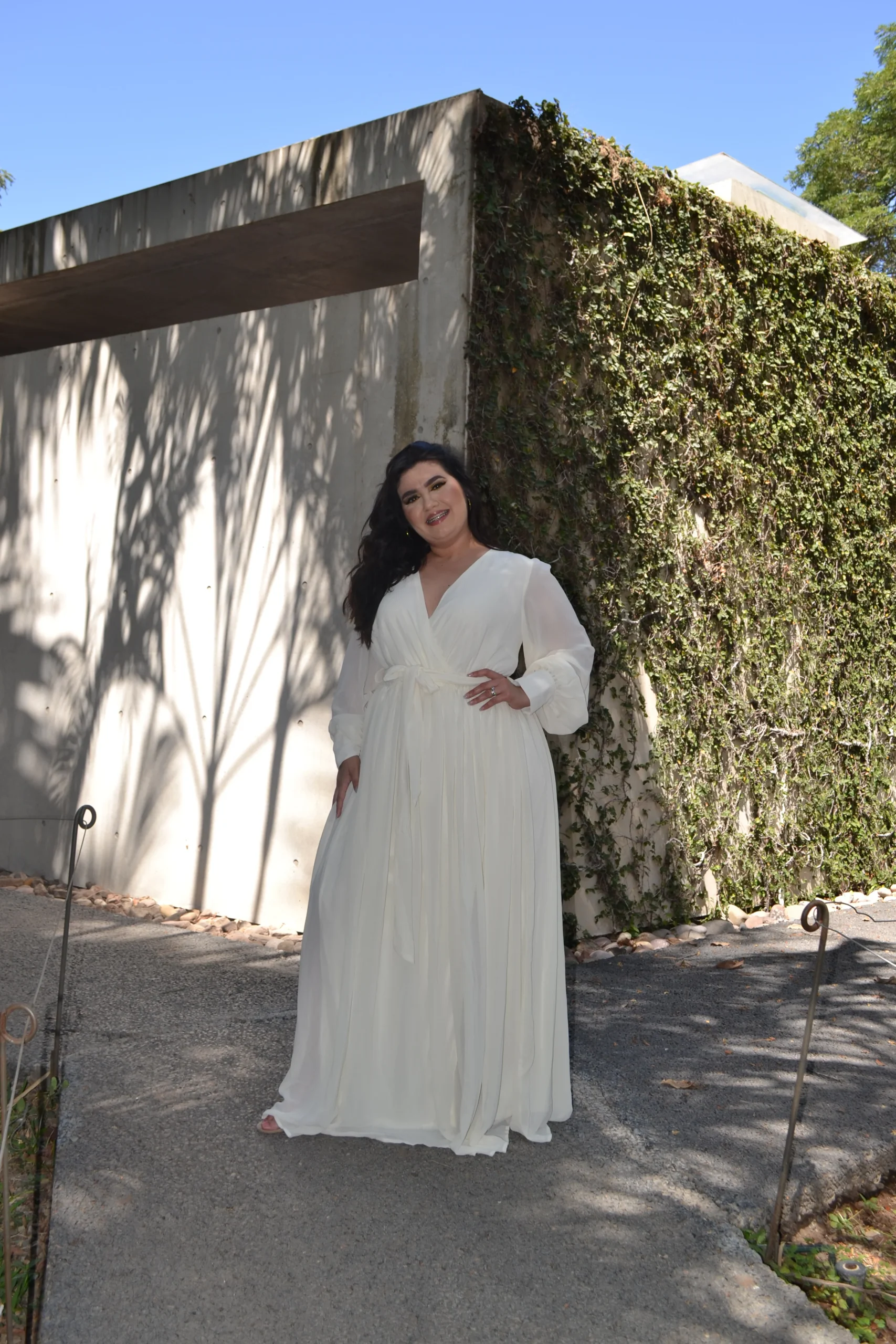 Modelo de vestido corte maxi con olan cuello v con manga larga súper cool ideal para lucir un outfit PADRÍSIMO 🥂 .