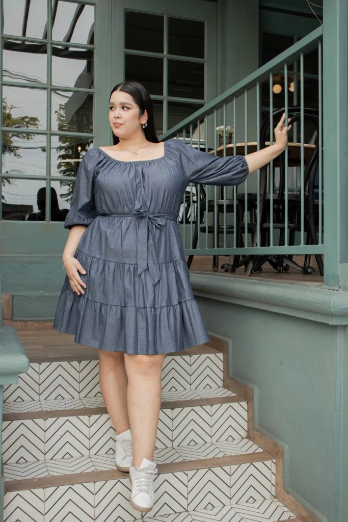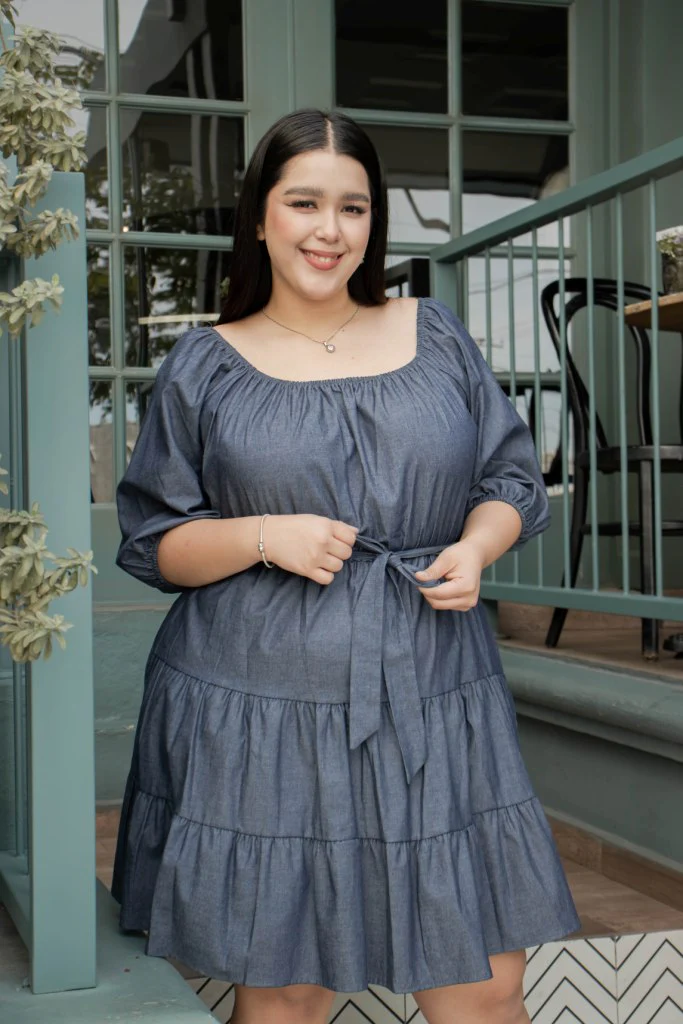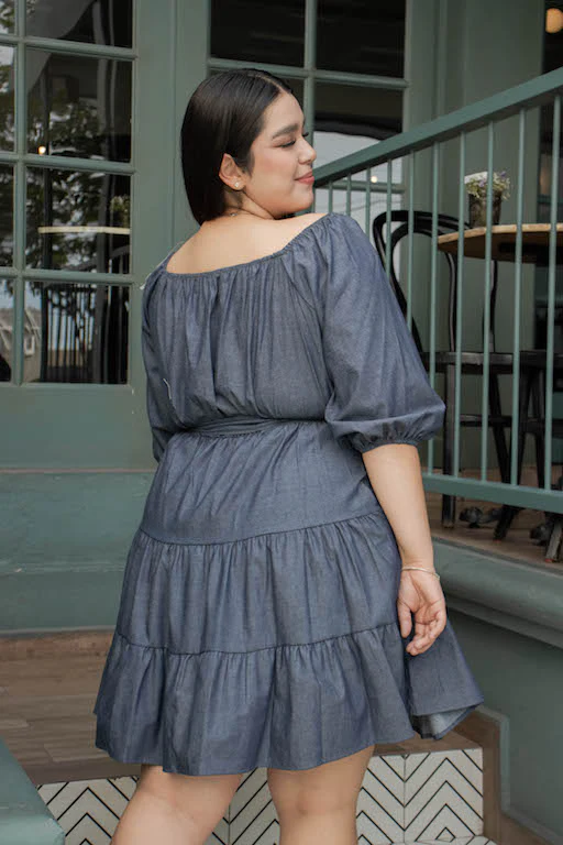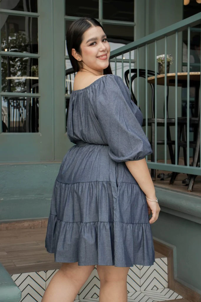 VESTIDO DE MEZCLILLA DE MANGA LARGA, CORTE EN A ESTILO PEMPLUM, CON LAZO EN LA CINTURA, LARGO A LA RODILLA. ESTILO OFF THE SHOULDER CON BOLSITAS .